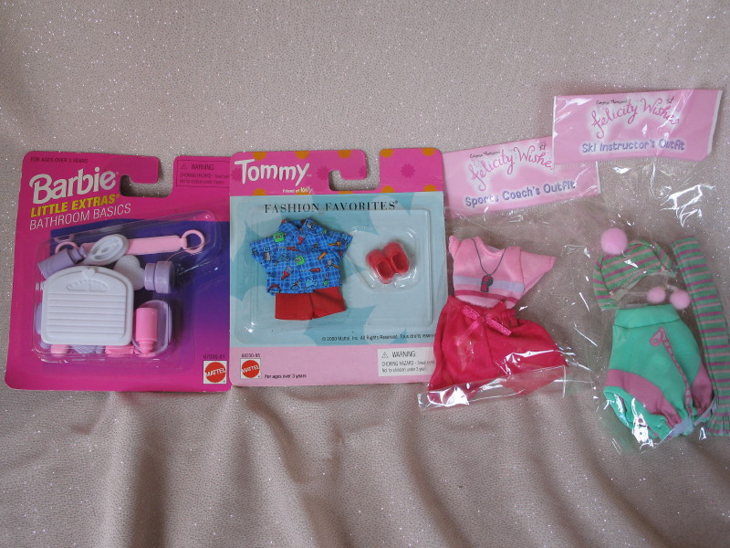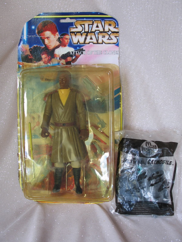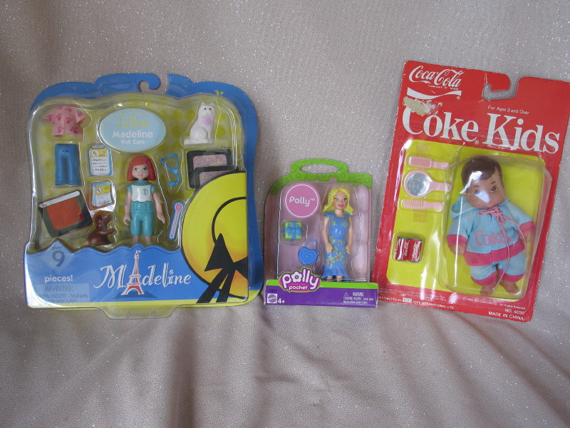 Lot 2. Mixed toys:- Scarce Mattel MIP Polly Pockets ‘Polly’ 2005 blue dress/present/handbag. MIP La Petite Madeline vet care. Coke-Cola kid on card, MIP Mc’Donalds Batman/mobile. Star Wars Figure Mace Windu 20cm still on damaged card. Barbie MOC bathroom basics, Tommy My Little Baby and more.