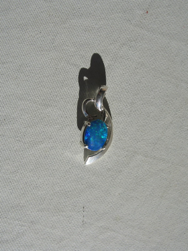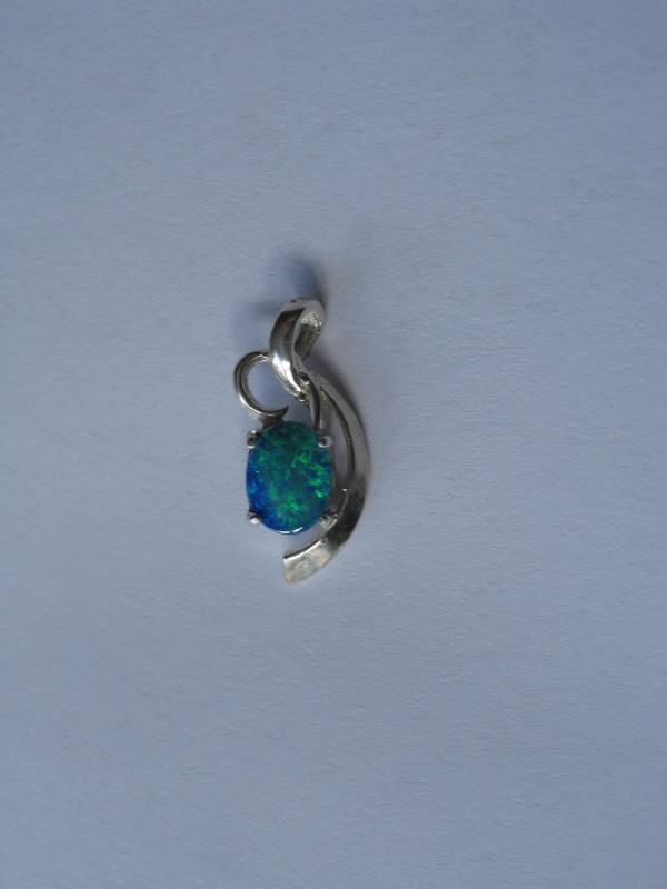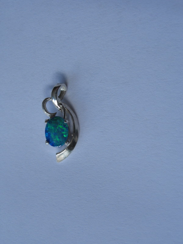 Ladies Crystal Opal-SS oval pendant. Coober Pedy 9mm long oval doublet Crystal Opal. Brightest B5 grade colour with predominantly green-blue rolling flashes. Elegant, intricate Sterling Silver surround with opal claw setting, overall weight 1.7gm. Stunning, vivid crystal opal pendant for a girl or lady. $350 – $400