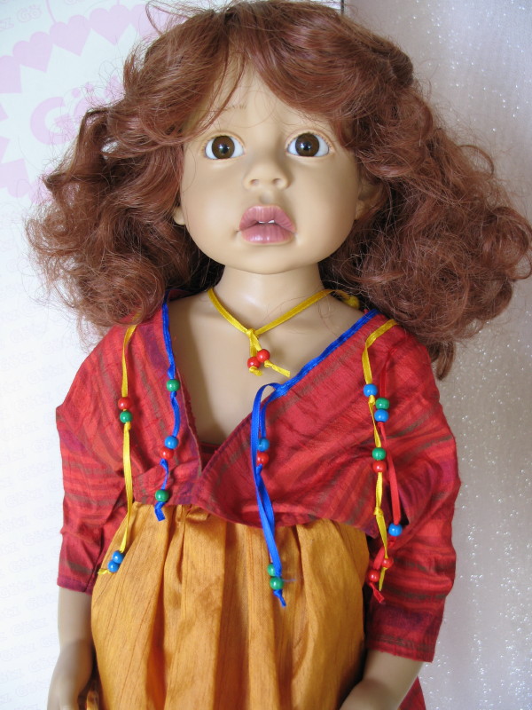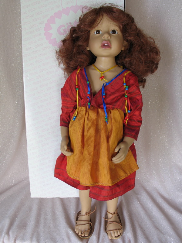 Gotz boxed artist Philip Heath “Alessandra” 1992 hard vinyl LE World of Children series 24″ (61cm). Excellent sculptured expressive face. All original with dark brown glass inserted eyes, brown lush hair, original dress outfit, and sandals.