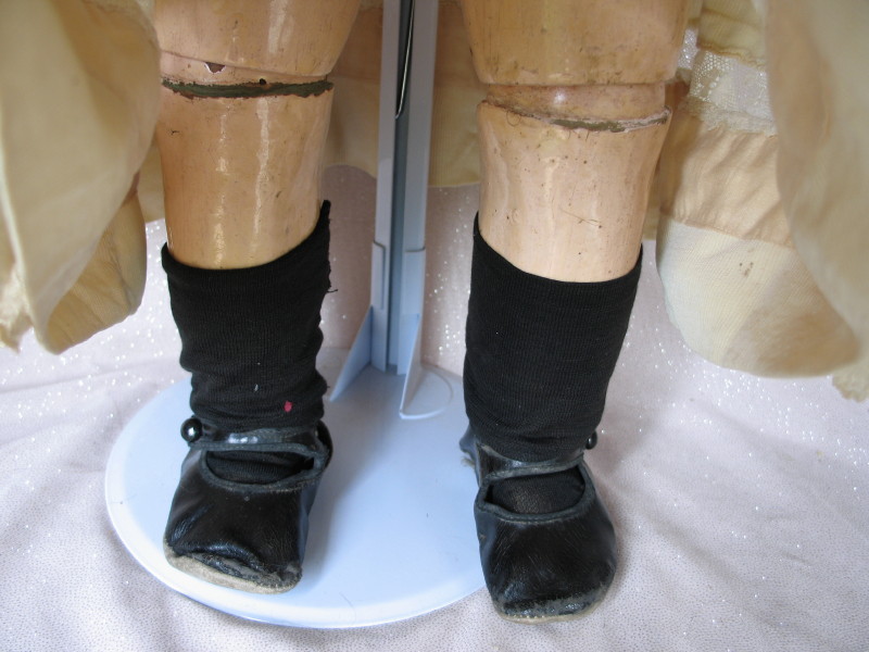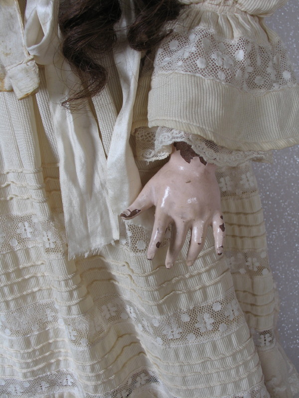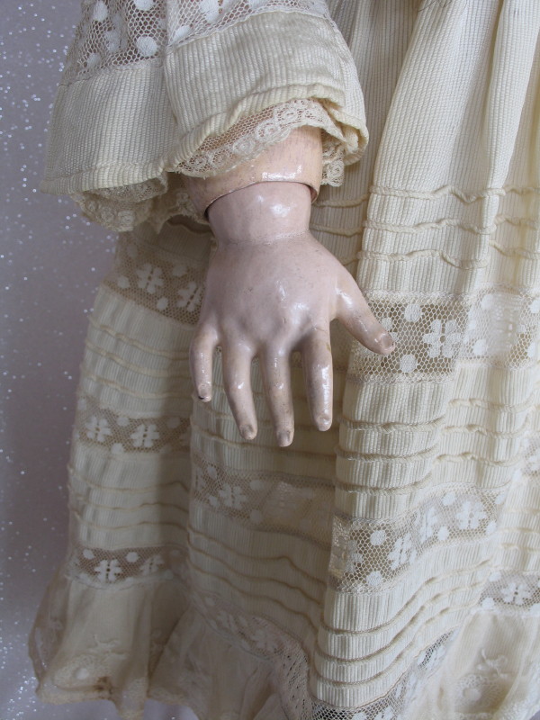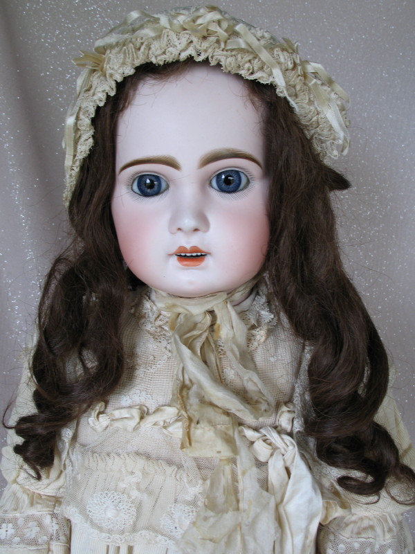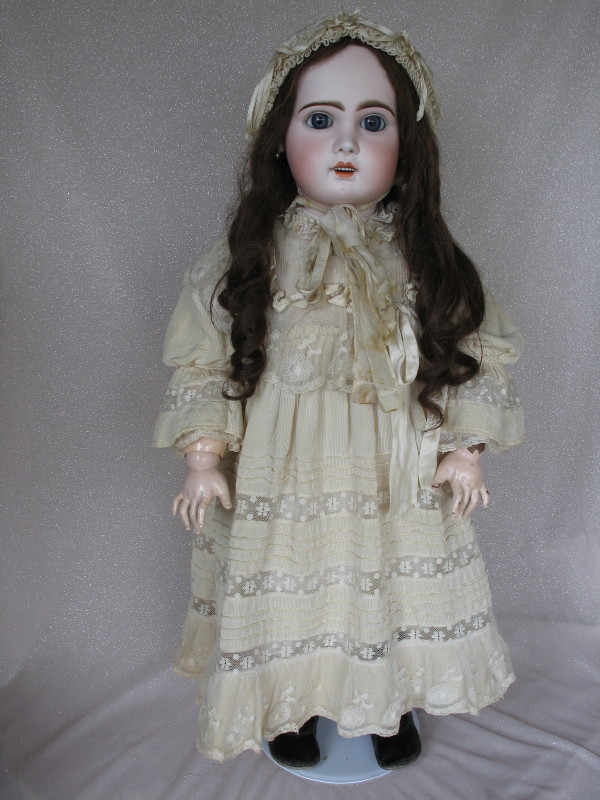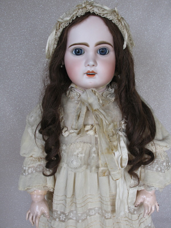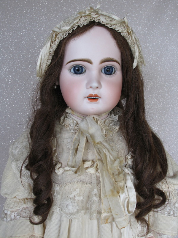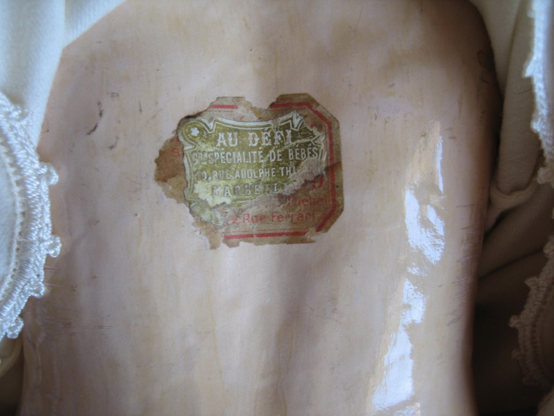 Special commission “Tete Jumeau” Bebe for Au Defi Boutique c1890s companion bisque 30″ (76cm) companion doll. Open mouth with red peek accents and inner shading, applied detailed pierced ears with drop earrings. Blue Guepratte paperweight eyes, bold angled lashes, long arched brown gloss brows with finer upper feathering. Neck incised ’14’ with checkmark. Cork antique pate has hard-to-read maker’s cupid stamp, Jumeau blue cap, human hair long ringlet wig. Original circular neck attachment. Chunky French ball jointed wood composition body, jointed wrists, and some paint flakes. Rare back paper gold label “Au Defi // 6 De Specialite De Bebes // 10 Rue Adolphe Thiers // Marseille // Reparations” with last word missing, revealing another red print label underneath. Antique original cream pique and French lace dress, whitewear petticoat, woollen cream petticoat, black socks, black leather shoes, and cream silk bonnet.
