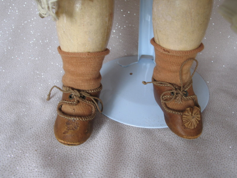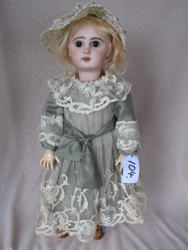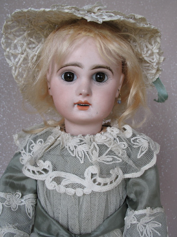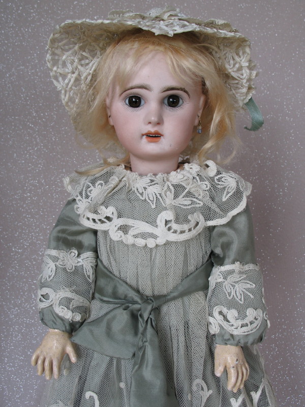 French Tete Jumeau Bebe c1890s, 18″ (46cm) bisque doll incised 7 on her neck. Open shaded mouth with peak accents, upper row of porcelain teeth. Brown glass paperweight eyes, black eyeliner, bold angled lashes, arched long lush brows with fine outer feathering. Pierced ears with one earring, original cork pate and replaced blonde mohair thinning wig. French wood ball jointed composition body with jointed wrists. Gray silk dress with vintage lace overlay and collar, undergarments, white hat, brown socks, and brown vintage leather shoes.