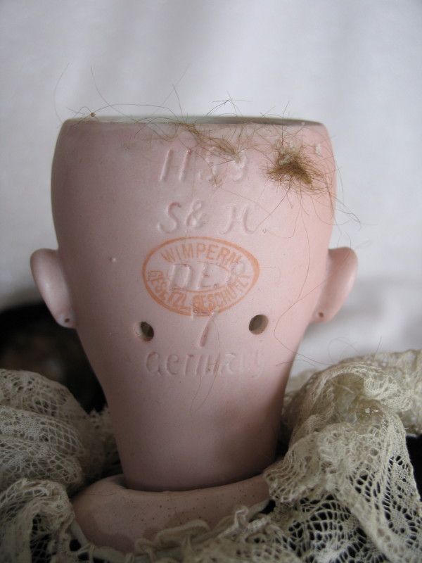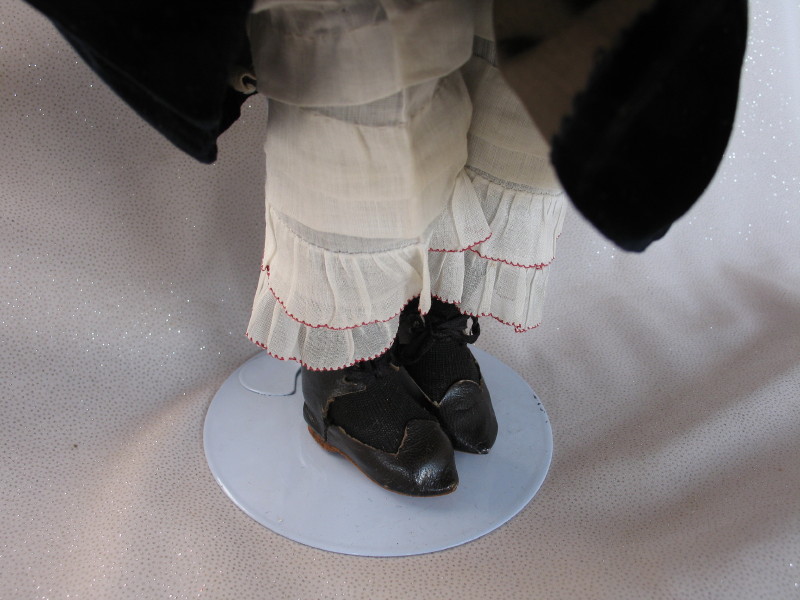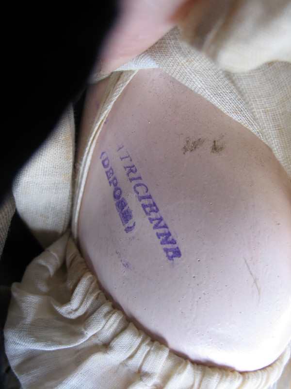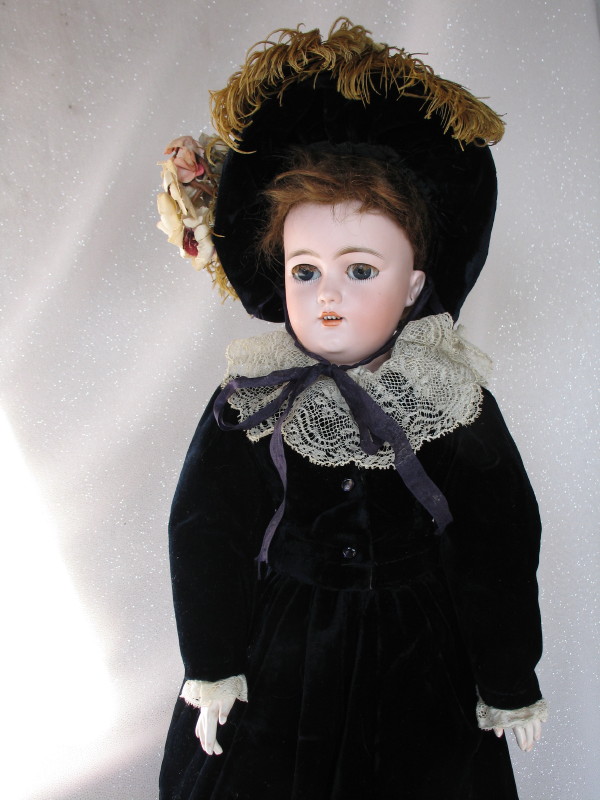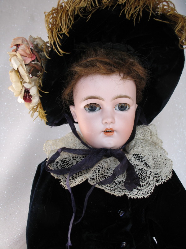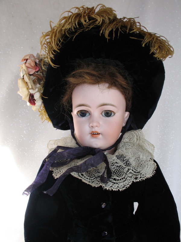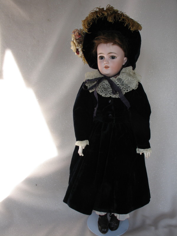 Scarce 1906-08 Simon & Halbig “Patrician” Lady bisque head doll,19.5″ (49cm) incised ‘1159//S&H//DEP//7//Germany’ and red Wimpern stamp. Blue glass sleep eyes, real mohair lashes, vertical lower lashes, feathered brows, right cheek rub, dimpled chin, pierced prominent ears, hairline from back pate rim. Original upswept brown wig. Original 1906-08 French ball jointed composition shaped lady body with slender fingers, blue stamped ‘La Patricienne Depose’ (brief trademark used by Daspres, successor of Jules Steiner), straight wrists and slender fingers. Couture navy blue velvet dress, long sleeve top, muslin blouse with wide lace collar. Matching hat with flowers and ostrich feathers. Original organdie petticoat, ruffled pantaloons, black stockings with some wear, and black leather original shoes.
