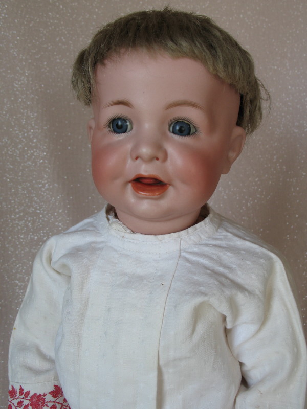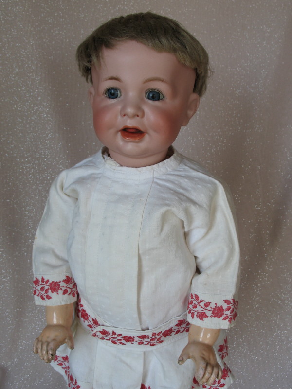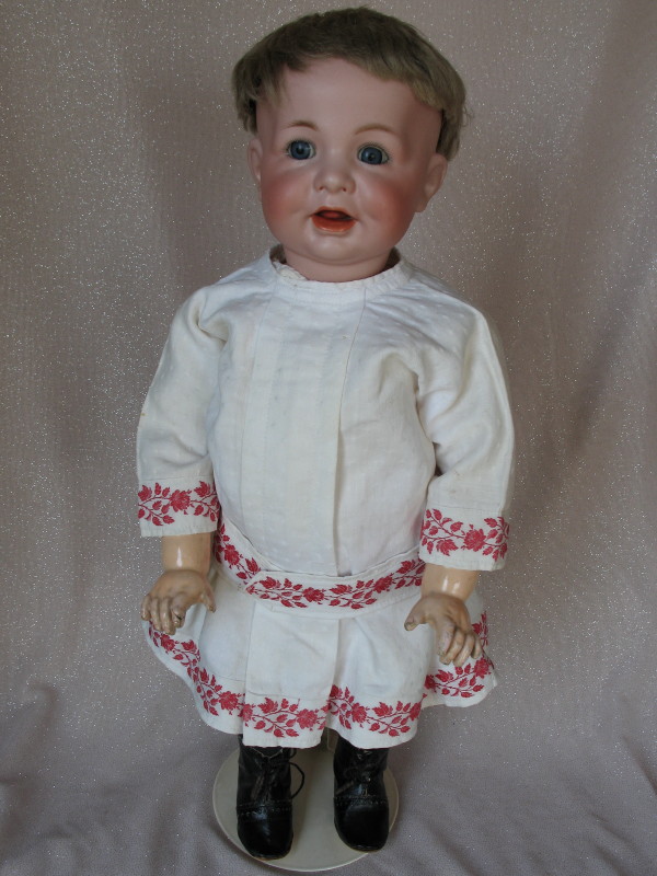 All original Kammer & Reinhardt 116A “Laughing Toddler” 16″ (41cm) bisque c1912. From the transition era of their art reform series. Incised “KstarR //Simon & Halbig //116A //42”. Blue glass sleep eyes with angled lashes, feathered brows, plump dimpled cheeks. Open mouth with two upper teeth and a tremble tongue. Ash-blonde mohair original wig and pate. Original wood composition body with ball joints at shoulders/elbows/knees/chubby hands and slant hips. Heavy white cotton coat/dress with embroidered red rose belt and matching hem, undergarments, black socks, and black leather lace-up boots.