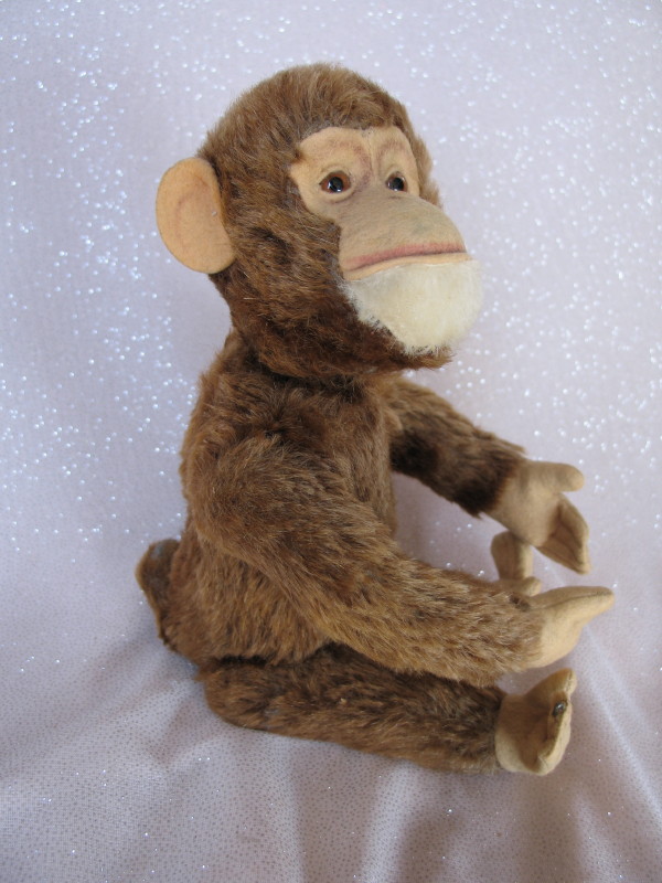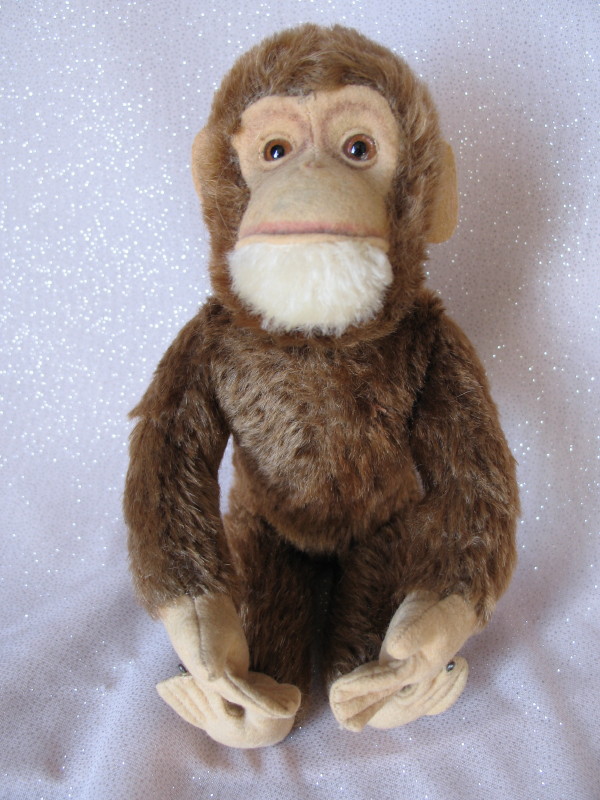 Scarce Schuco Tricky Yes/No Monkey 1950s, 26cm. Chocolate brown mohair wood fill. Brown back-painted glass eyes, white mohair chin, felt face, and pads with two wires peeking through, non-working tummy squeaker. Yes/No tail operates correctly.
