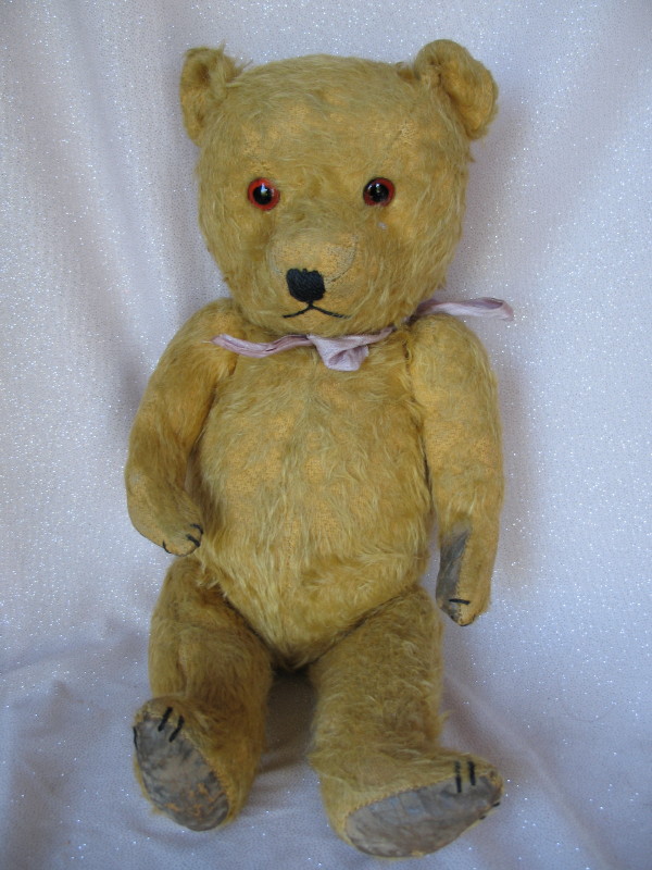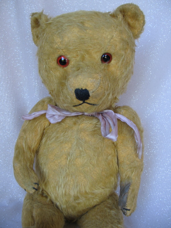 English Chiltern bear c1940s 18″ (46cm) gold mohair. Fully jointed wood filled, black over-stitched claws, amber glass eyes, shield nose-mouth, brown rexine shaped pads. The back seam is re-stitched at the non-working growler and shows general wear.