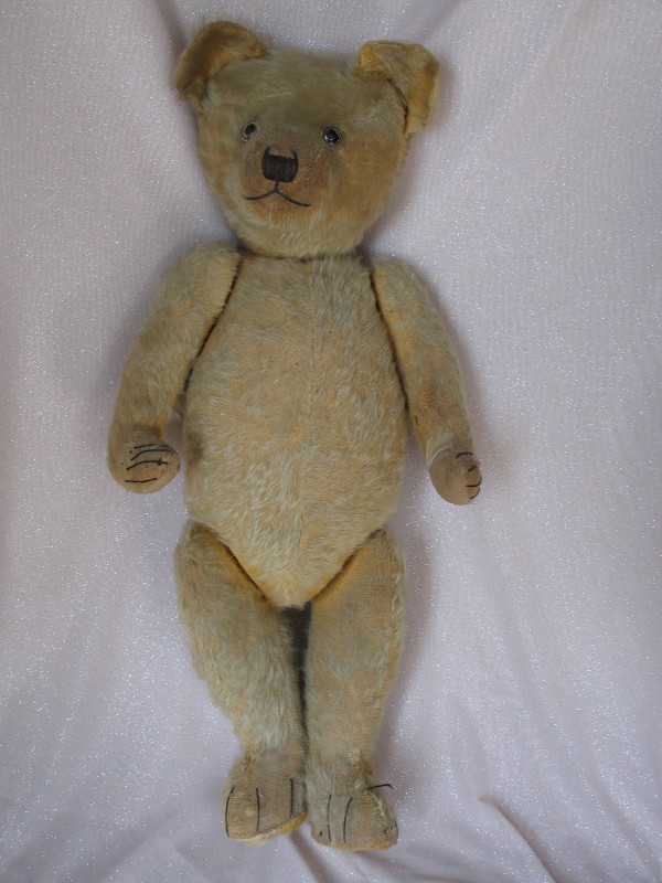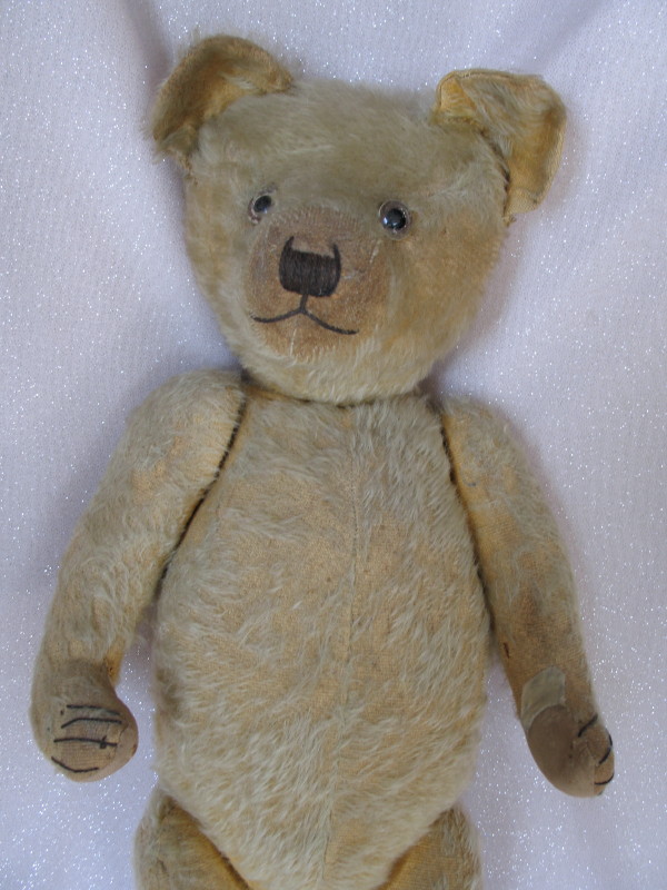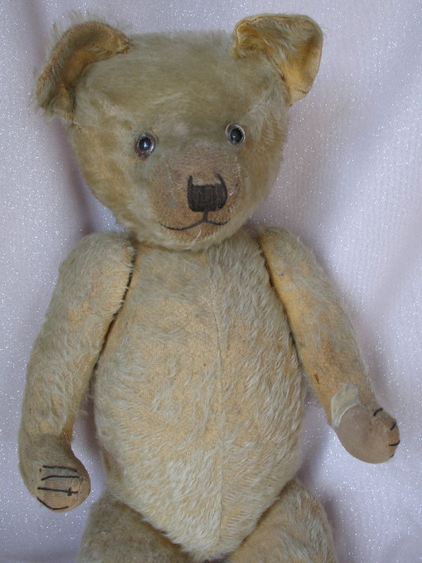 English Chiltern 1920s Bear 26″ (66cm) faded sparse 75% mohair. Fully jointed with wood wool fill. Brown back-painted glass eyes. Partially shaved muzzle, vertical stitched nose with longer upper outer threads, inverted Y-mouth. Cotton pads on three and right leg pad is missing exposing the inserted cardboard insert. Original claws bar one, non-working growler. Loved forever in one family.