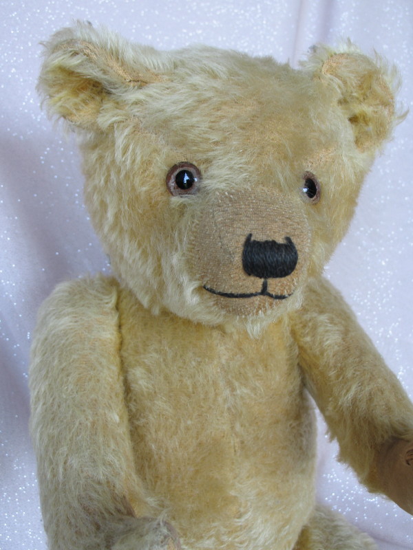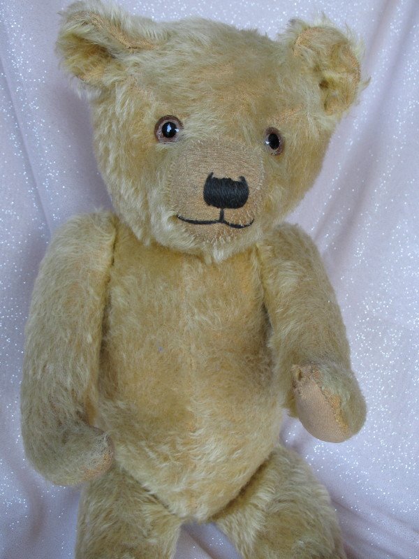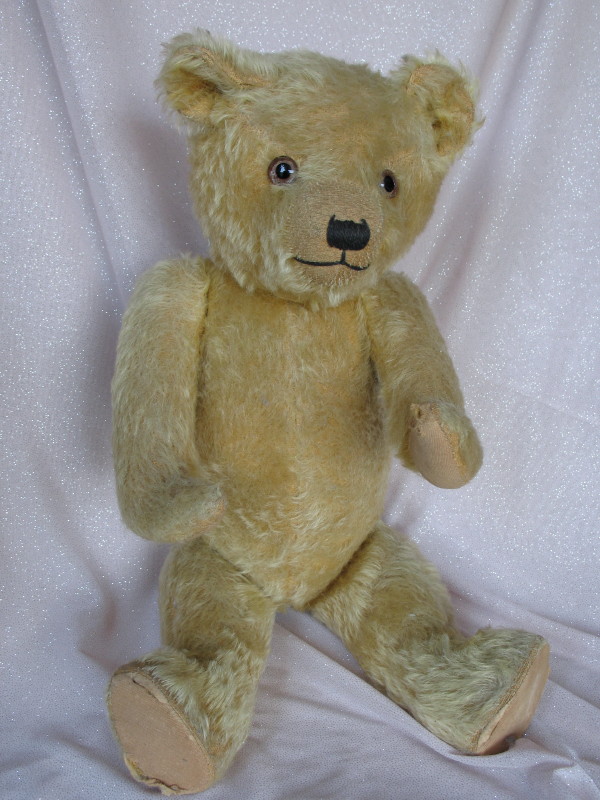 Early Chiltern 1920s Bear 21″ (53cm) is hard to find. Fully jointed mohair with wood wool fill. Brown back painted glass eyes. Partially shaved muzzle, vertical stitched nose with longer upper outer threads, inverted Y-mouth. Cotton pads have tip wear on the left pad, cardboard insert feet with some edge wear, and a non-working growler. Early regal Chiltern with the look and in very good condition.