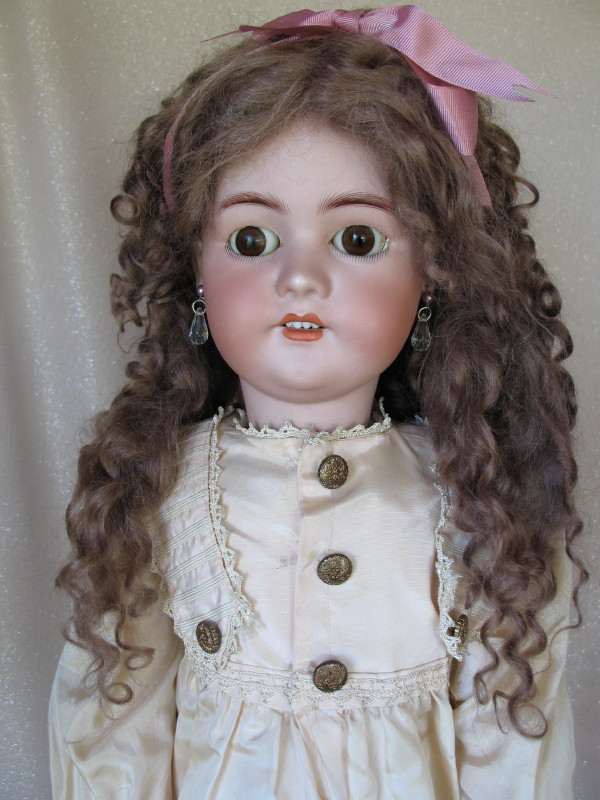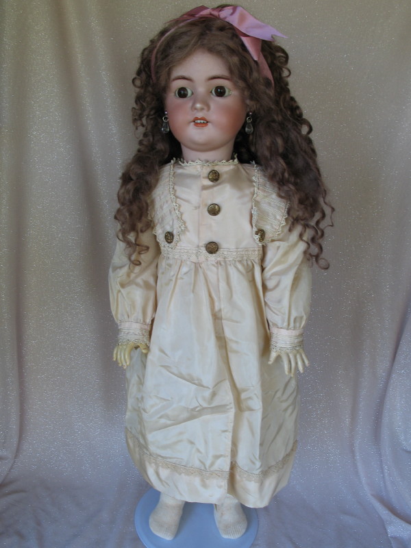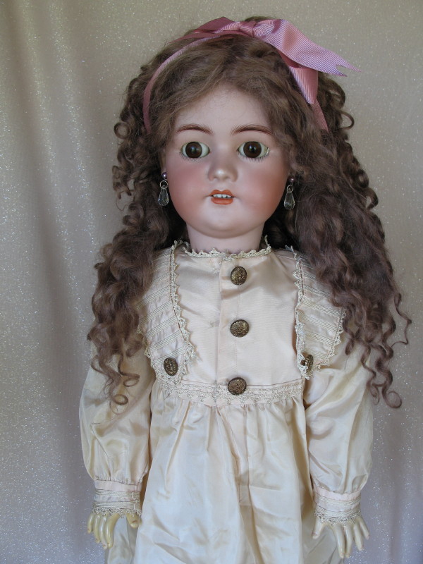 Bisque Simon & Halbig 1078 character child 29″ (74cm) c1890s. Brown glass sleep eyes, vertical lower tapered lashes, gloss feathered brown brows. Open pink shaded mouth with red peak accents, row of upper teeth. Original mushroom brown lush wig with factory extensions, old cardboard pate. Pierced ears with drop earrings, very good wood-composition ball jointed body with delicate red accents. Pink dress with gold buttons, undergarments, and cream socks.