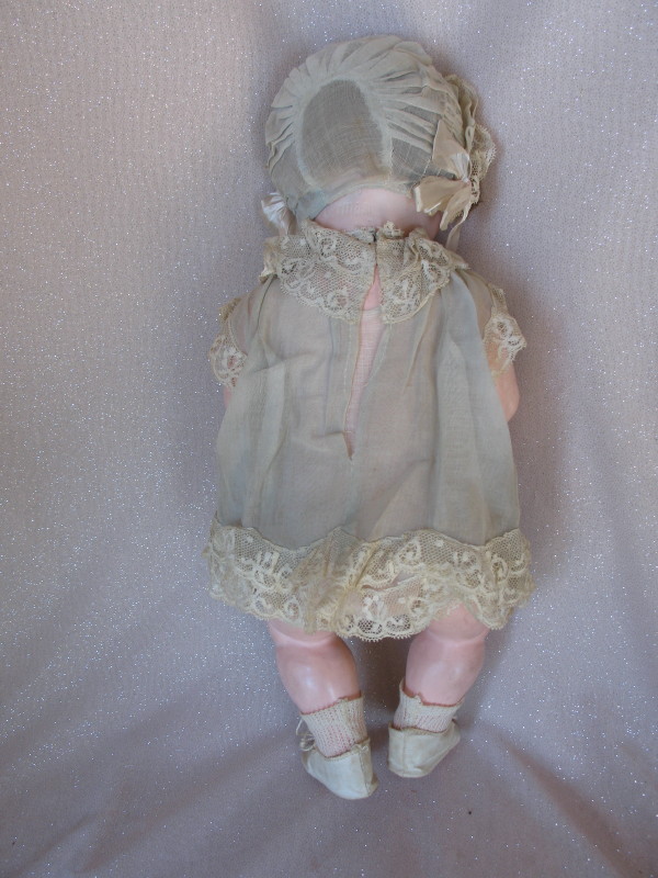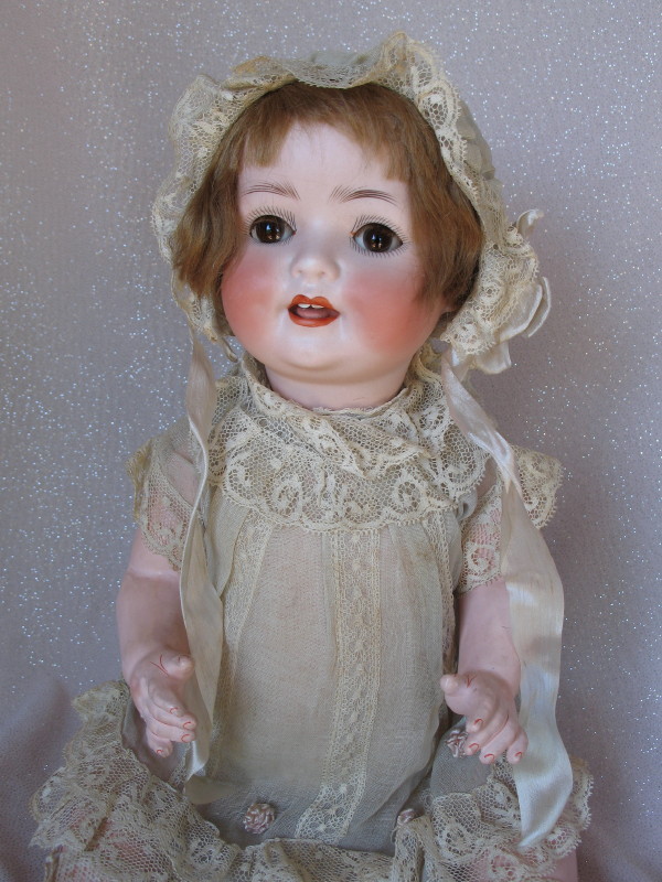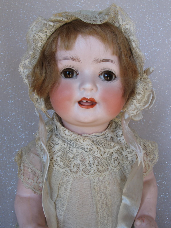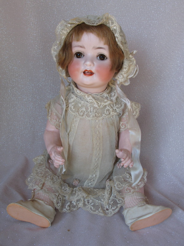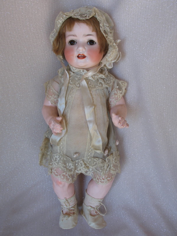 Factory original Ernst Heubach Koppelsdorf 300 Baby 16” (40.5cm) c1920 bisque. Brown glass sleep eyes, angled and real lashes, feathered brown brows. Open red mouth with peak accents and two upper teeth, tremble tongue, and chin-cheek dimples. Original light brown mohair wig and pate. Composition bent limb baby body with red accents in factory condition. Original organdy lace trim dress with pink silk flowers, and onsie. Matching lace trim bonnet with silk ties, white socks, and rexine shoes. All original rare factory condition.