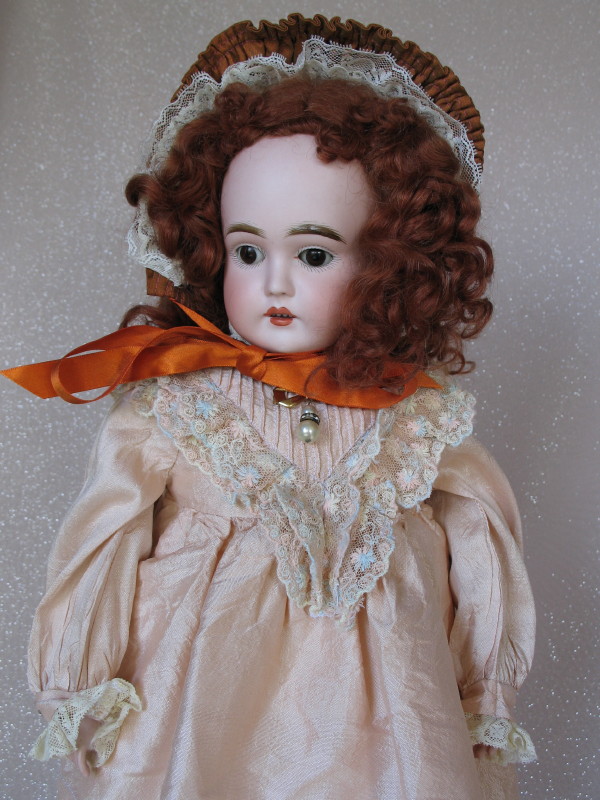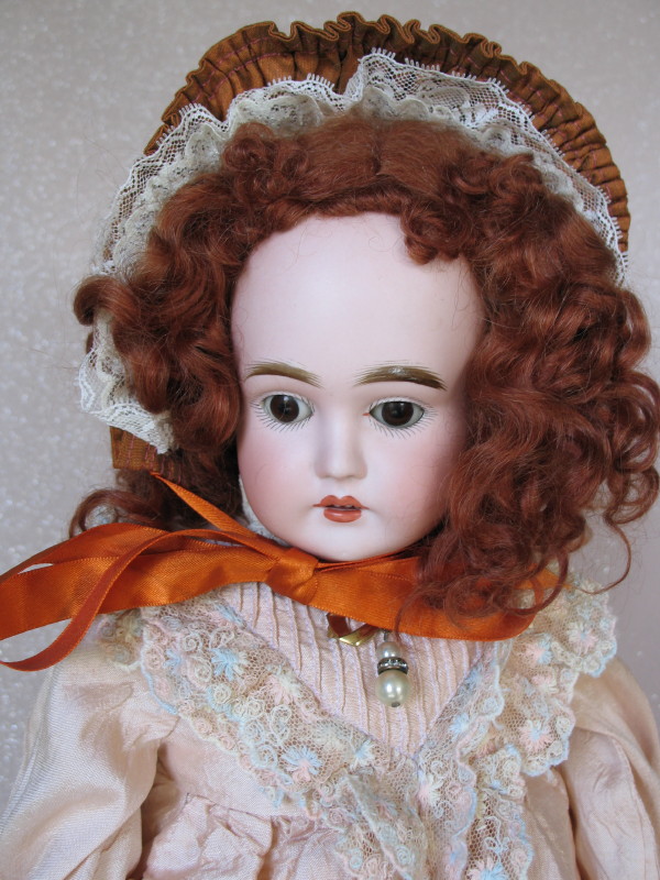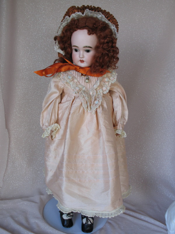 Early J.D. Kestner Turned shoulderhead c1880s 23” (58cm) bisque child incised ‘J’. Brown glass sleep eyes, angled lashes, gloss lush feathered molded brows. Open gloss pink-red mouth with darker peak accents, four upper teeth. Auburn replaced wig over human hair blond wig, and a plaster pate. Original kid leather rivet replaced jointed legs, some leakage at knee gussets, modeled bisque forearms. Pink modern dress with lace trim, hat, white long socks, and black shoes.