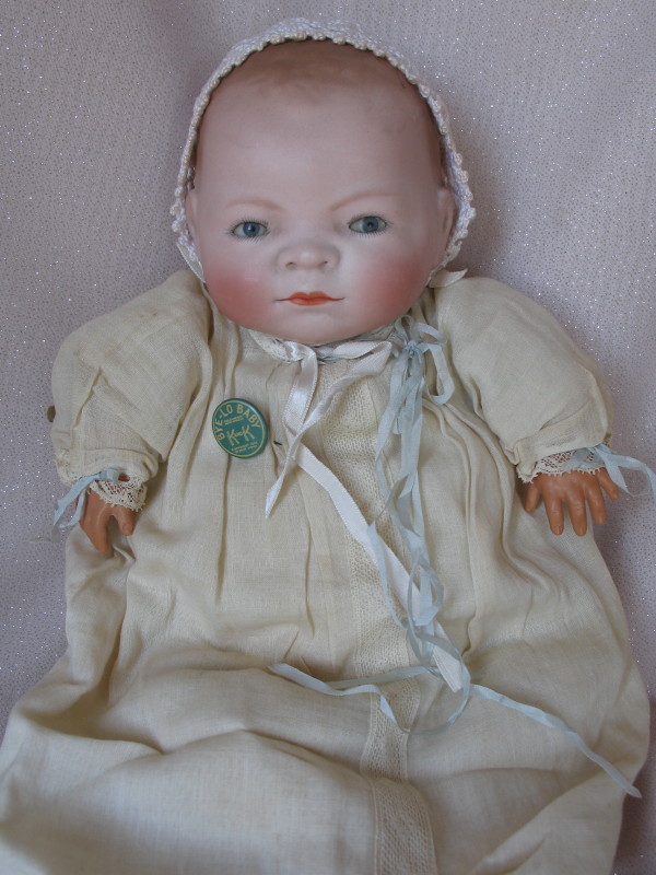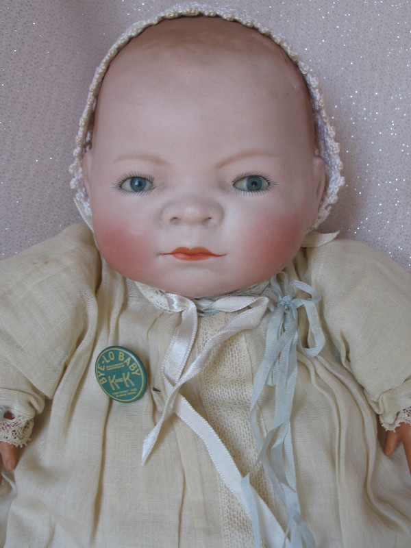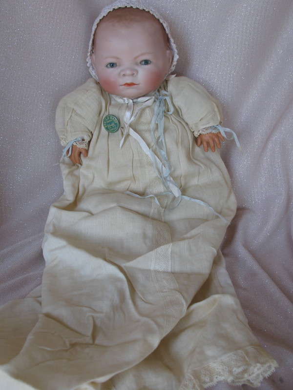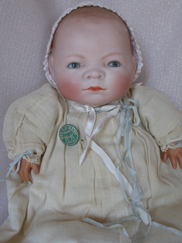 Lot 137. All original Grace Story Putnam Bye-Lo Baby 15″ (38cm) bisque swivel head. Closed mouth with wide red centerline, blue glass sleep eyes, angled lashes, russet brows, lightly molded front curls, sprayed brown hair. Cloth frog body, non-working crier, red stamped details on chest, celluloid hands. Cream cotton baby gown, petticoat, nappy, added bonnet, and original pin badge . $300 – $400