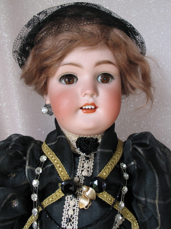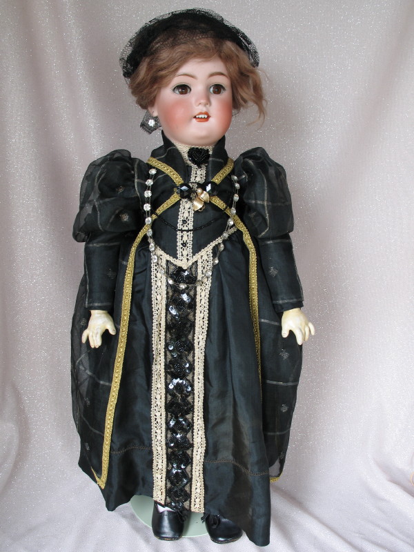 Bisque Simon & Halbig Dolly Face 22″ (56cm) 1900s. Open red mouth and a row of upper teeth. Brown glass sleep eyes, real-angled lashes, feathered brown brows, pierced ears with one glass earring. Original brown mohair brown wig and pate never removed. Good composition ball jointed body. Black silk dress with gold/white lace trim, beaded central feature, black net lace hat, glass necklace, undergarments, white socks, and black shoes.