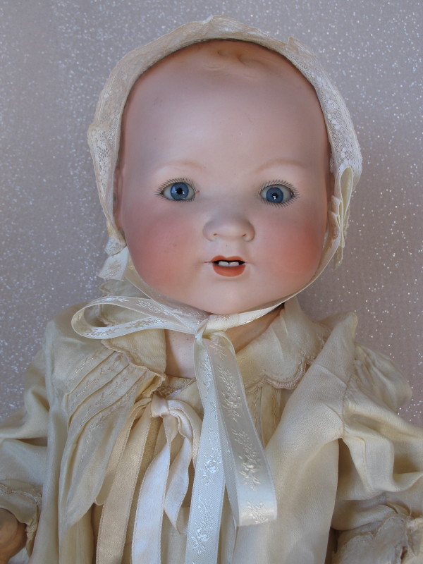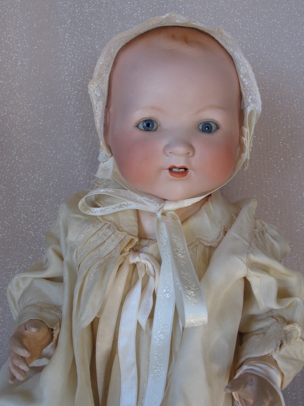 Bisque head Armand Marseille 351 Dream baby lifesize 22″ (56cm) 1910s. Dome head with light molded front curls, blue glass sleep eyes, angled lashes, russet brows. Open red mouth with two lower teeth. Five piece bent limb baby composition body with repainted fingers. Cream blend baby wear, Antique cream silk cape, Antique lace bonnet, dummy, and booties.