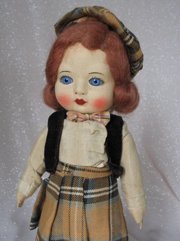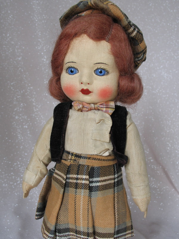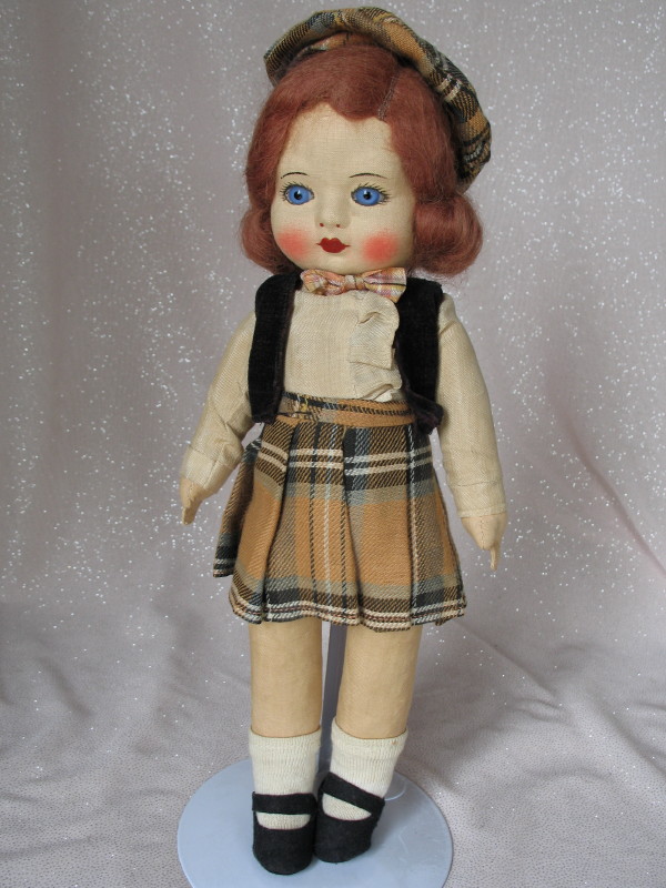 Lot 150. All original vintage cloth doll 12″ (30cm). Swivel head, inserted blue glass eyes, lashes, upper-side lashes, closed gloss red mouth, blushed cheeks, auburn applied mohair applied wig, arched stoke brows. Five pink cloth straw filled swivel body with separate thumbs. Original brown pattern pleated skirt, long sleeve blouse, bow tie, black velvet bolero, undies, matching tam, white socks, and black felt shoes.