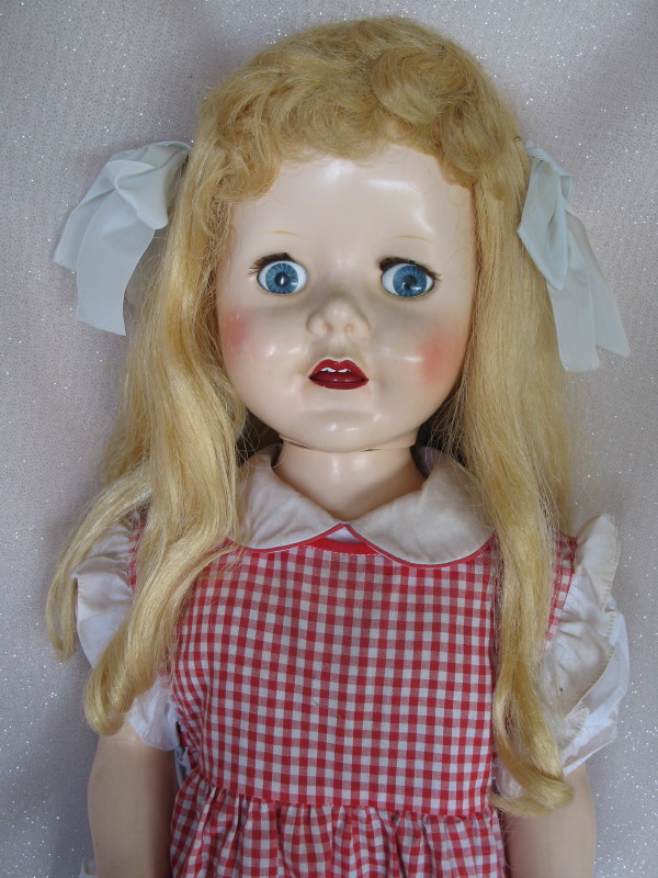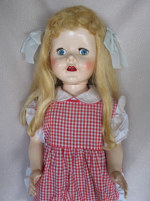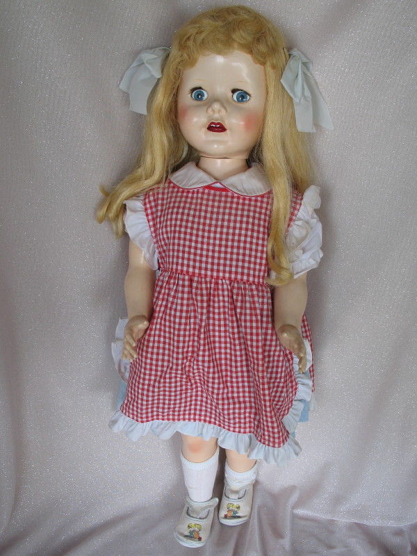 HP Pedigree “Belles of Brighton” 29″ (73.5cm) walker c1955. Blue flirty/sleep eyes with replaced lashes, long honey blonde saran applied wig with front curls, red mouth with upper teeth, cheek blush, very good retained colour, knee/hand blush. Blue stripe dress, red check pinafore, undies, white socks, and shoes.