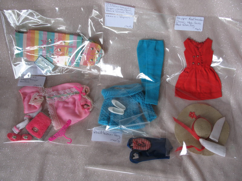 Mixed 1960s Mattel Barbie/Skipper clothes. Skipper Red Sensation #1901 dress-hat. Outdoor Casual 1965 sweater-slacks-white flats #1915. 1965-69 blue swimsuit #1030. 1965 Sunny Pastels dress-handbag #1910. 1967 Skipper Baby Doll, pyjamas-scales-slippers-coathanger.