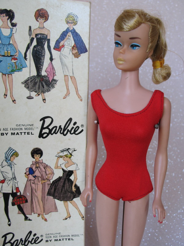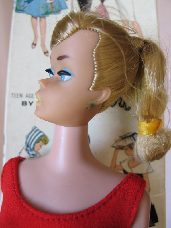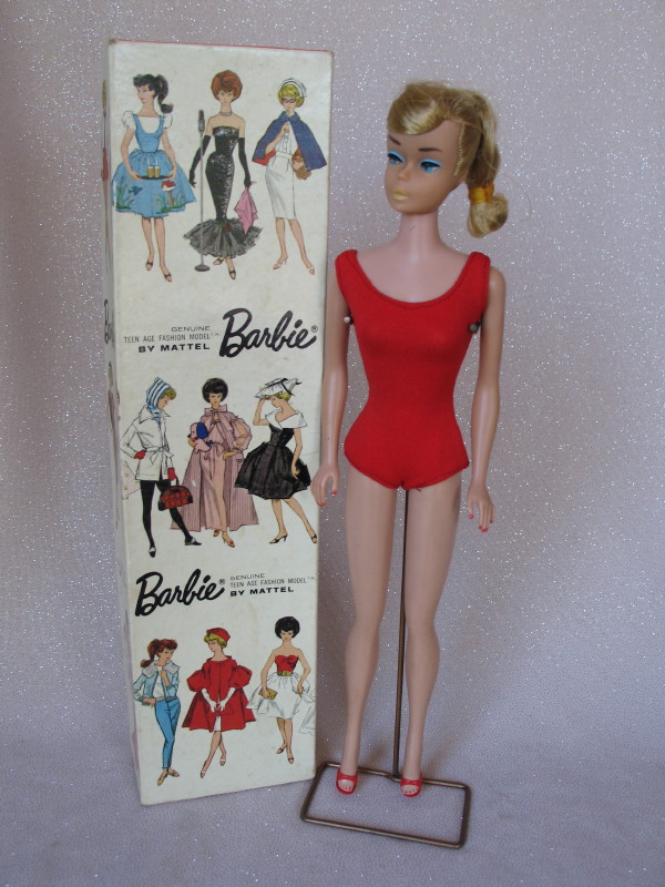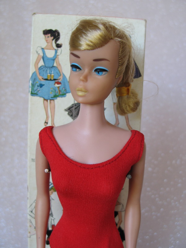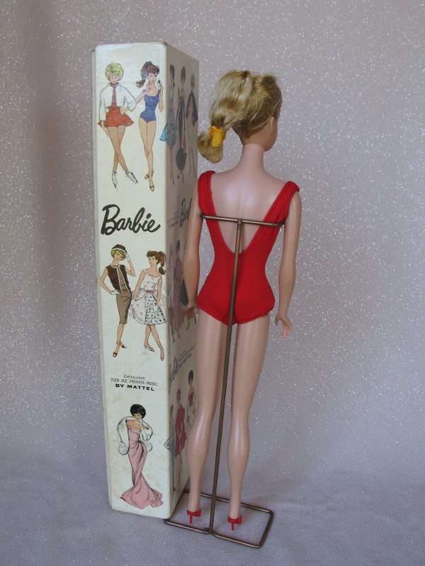 ‘Ponytail Swirl’ 1964 #850. Ash blonde hair in the original set, one green ear, red swimsuit, red heels, stand, excellent box.