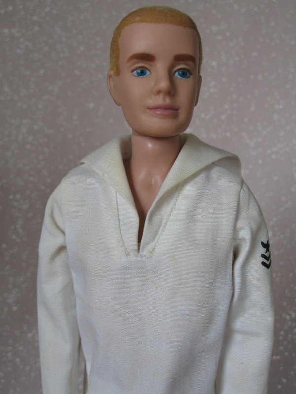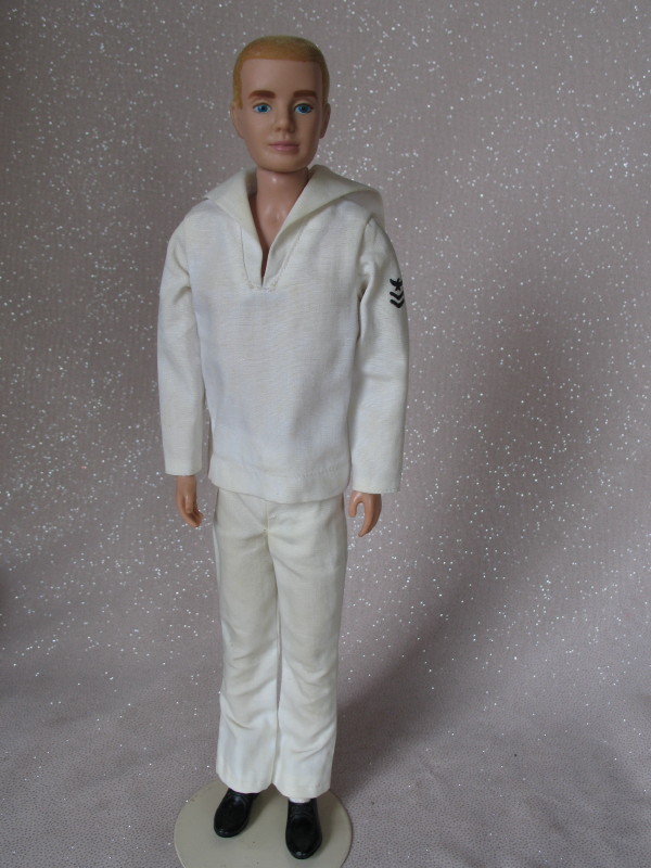 Blonde flocked hair #750 has a bald top patch, Original Sailor #796 tagged jacket, pants, and black shoes.