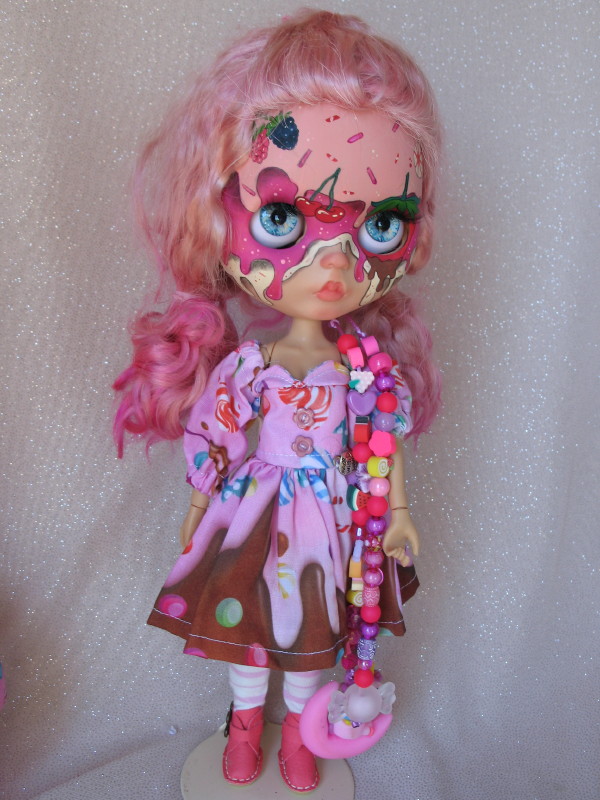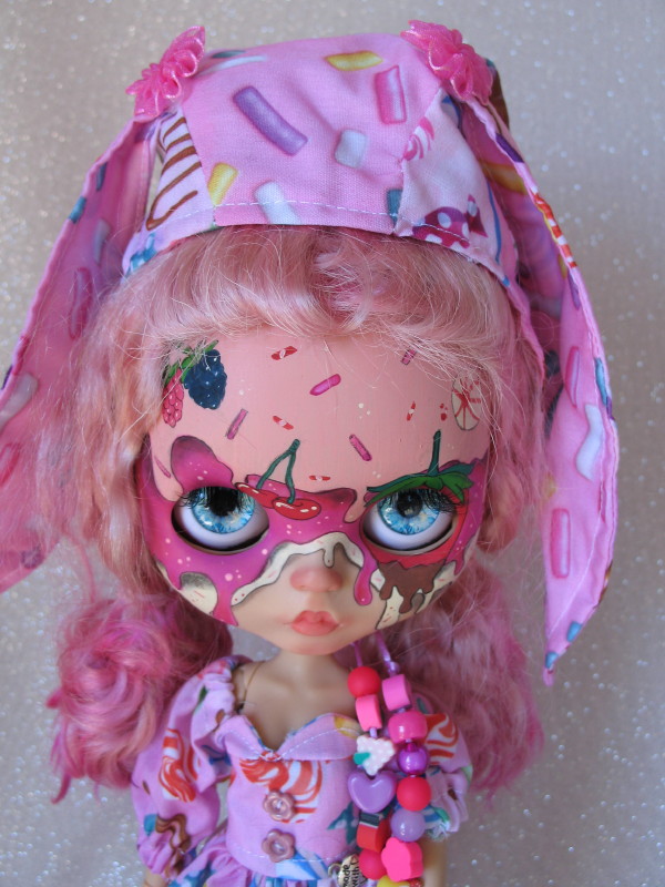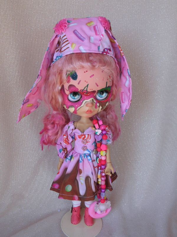 OOAK 2023 artist Diamondoll ‘Cupcake’ BJD Blythe Custom fashion doll #705. Two-tone pink hair, pink icing painted eyelids, cupcake decorated face and back. Pink cupcake print dress, with a heart tag, long pastel socks, and pink ankle boots, pink lolly print hat with long ears, decorative eye change pull cords.