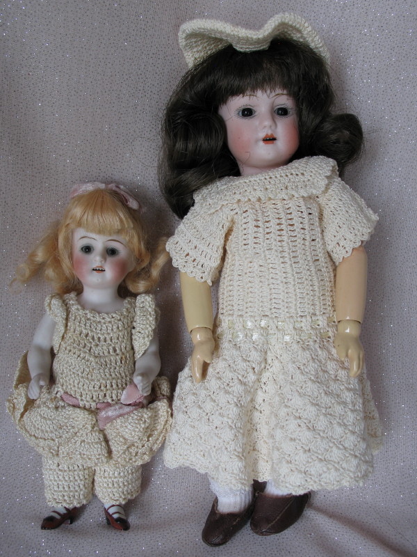 Cabinet bisque Herm Steiner child 23cm. Fixed brown glass eyes, angled lashes, arched brows, open pinkwith upper teeth. Black wig/pate are replaced. Jointed composition body with replaced forearms, Cream crochet beret and dress, undergarments, socks, and brown shoes. $50 – $75