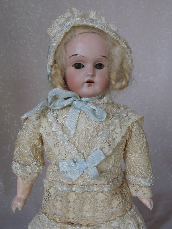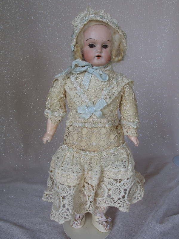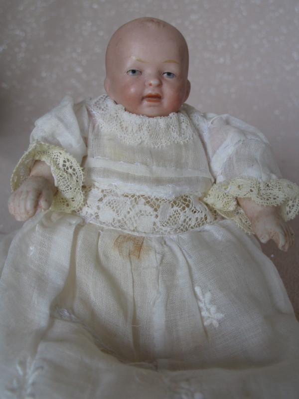 Two Antique bisque dolls:- Unmarked German shoulderhead 30cm, vintage lace dress, brown s/eyes, pink mouth with u/tiny teeth, cloth body with lower composition limbs. Dome head 13cm German baby with broken bisque neck rim, painted features, replaced cloth body, bisque forearms, lace embroidered gown.