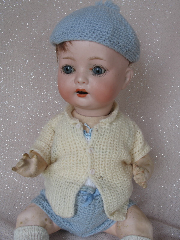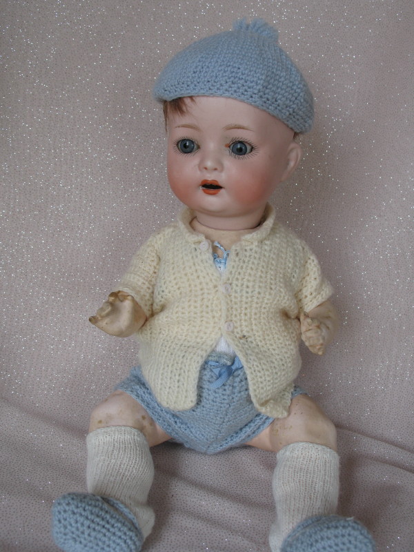 German Porzellanfabrik Mengersgeuth baby 12″ (30cm). Blue glass sleep eyes, angled lashes, feathered brows, open mouth with peak accents, two teeth. Bent limb composition baby body, short mohair wig/pate. Suitable blue-cream crochet baby wear.