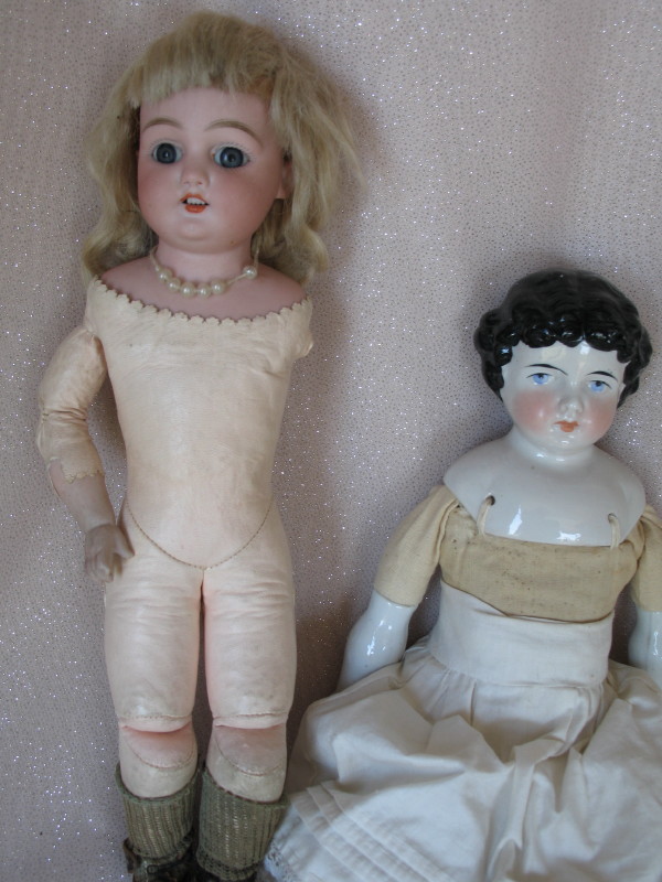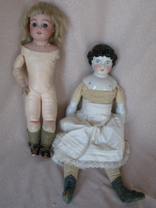 Two Antique dolls:- Bisque Simon & Halbig 1080 shoulderhead 12″ (30cm) c1892. Blue glass sleep eyes, angled lashes, feathered brows, open mouth with row of upper teeth. Pink kid leather gusset jointed body is missing left arm. Lush mohair blonde wig not removed, olive lace socks, and weary antique leather shoes. Chinahead Highbrow incised 180, cloth wood fill body with sewn-on blue leather boots.