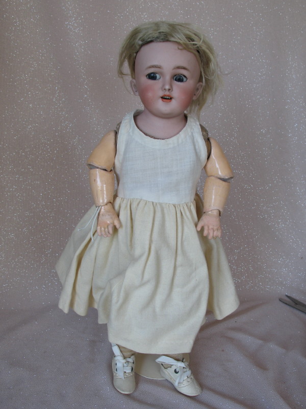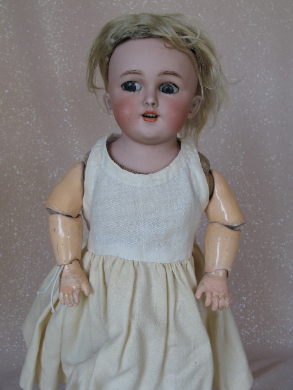 Lot 269. Bisque Simon & Halbig 1250 shoulderhead 33cm c1898. Blue glass sleep eyes are loose inside the head, open mouth/teeth, molded feathered gloss brows, pierced ears, mohair wig/pate. Pink kid leather body with composition arms, missing the elbow balls.