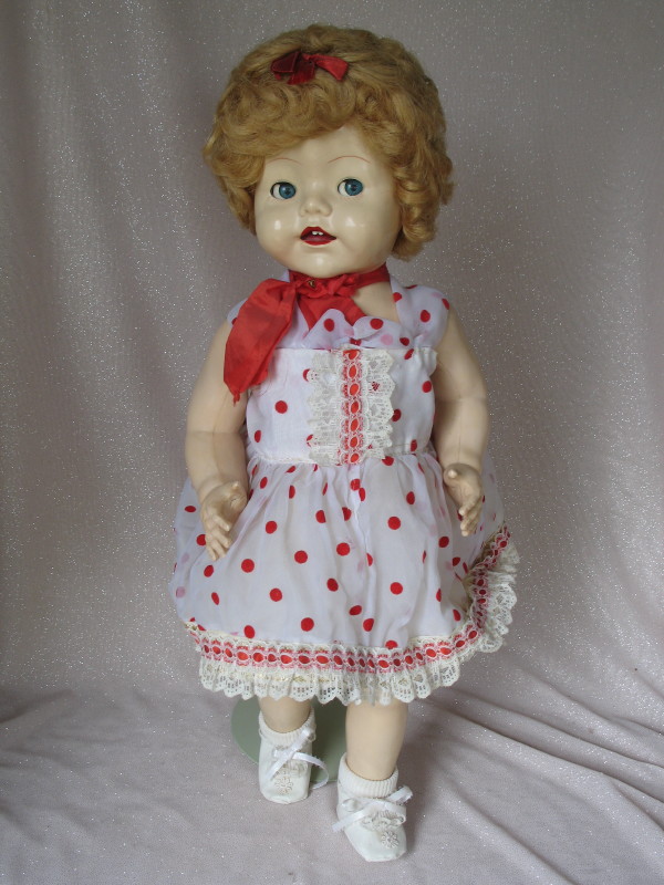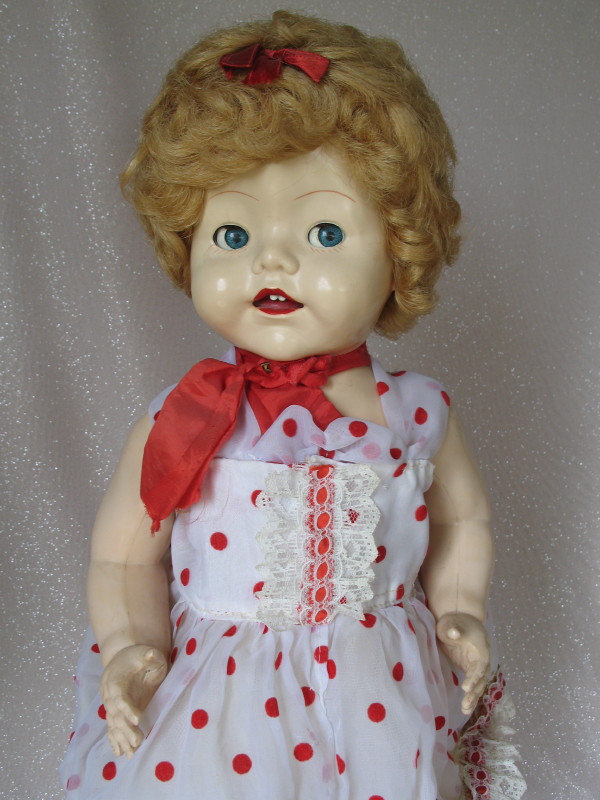 Australian Pedigree Saucy Walker 50s HP 56cm. Blue flirty/sleep eyes, open mouth/two teeth, honey-blonde saran short wig, red polka dot dress outfit.