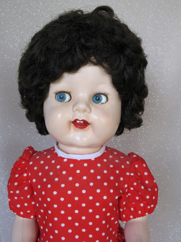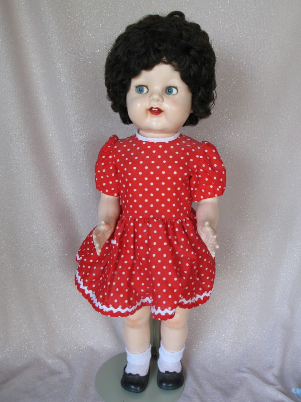 HP 56cm (22″). Blue flirty/sleep eyes, replaced lashes, open red mouth, two teeth, lush black saran short wig, red polka dot dress, socks, and black shoes.