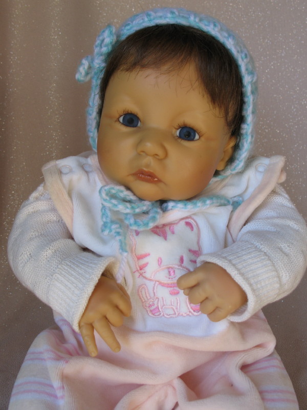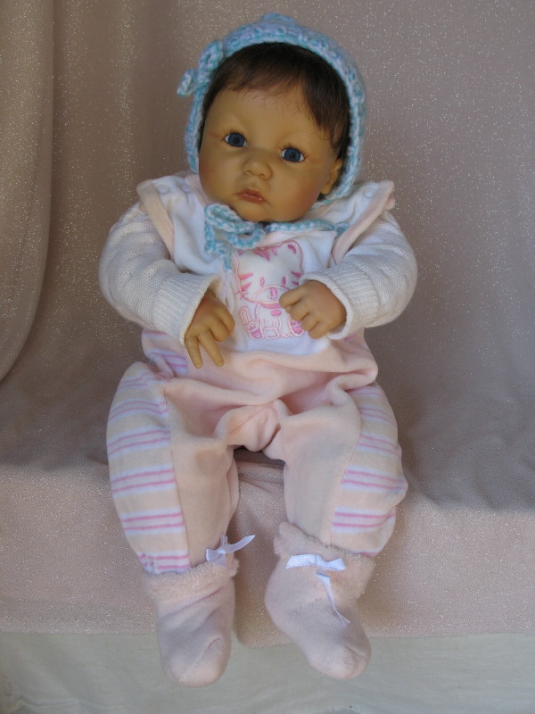 46cm weighted hard vinyl. Pink baby wear, and a blue knit bonnet.