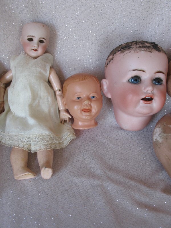 :- include SFBJ 301 with no eyes/wig 24cm. Max Handwerck Bebe Elite size 7 head, no wig or eye rocker and the unstrung baby body missing one leg. Composition body 26cm. and a small celluloid head.