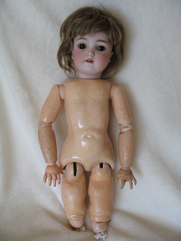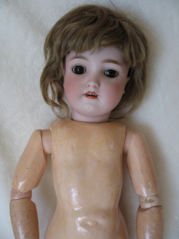 TLC German Antique bisque Heinrich Handwerck ‘Dolly Face’ naked. Brown glass sleep eyes, feathered brows, accented mouth with upper teeth, pierced ears. Original pate and brown mohair wig. The composition ball jointed body is missing lower legs and one finger. She measures 36cm to knees.