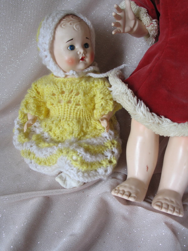 dolls:- Pedigree 41cm Delite walker, short saran wig, flirty/sleep eyes, real lashes, red velvet dress only. Australian Cherub 25cm in lemon knit.