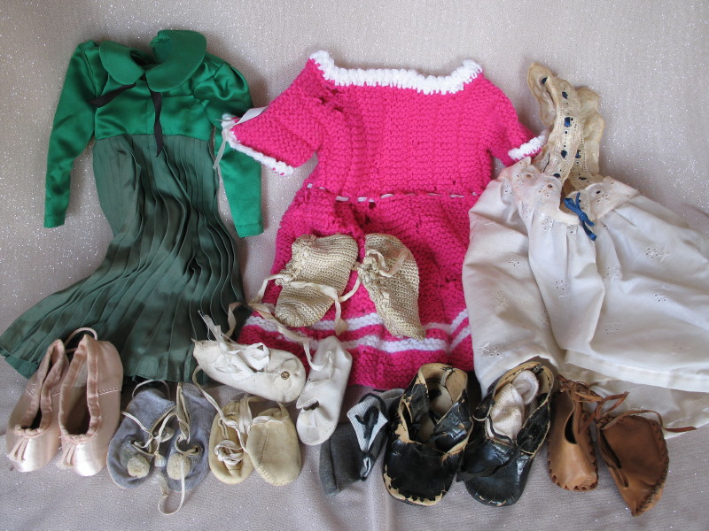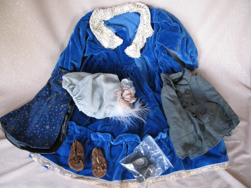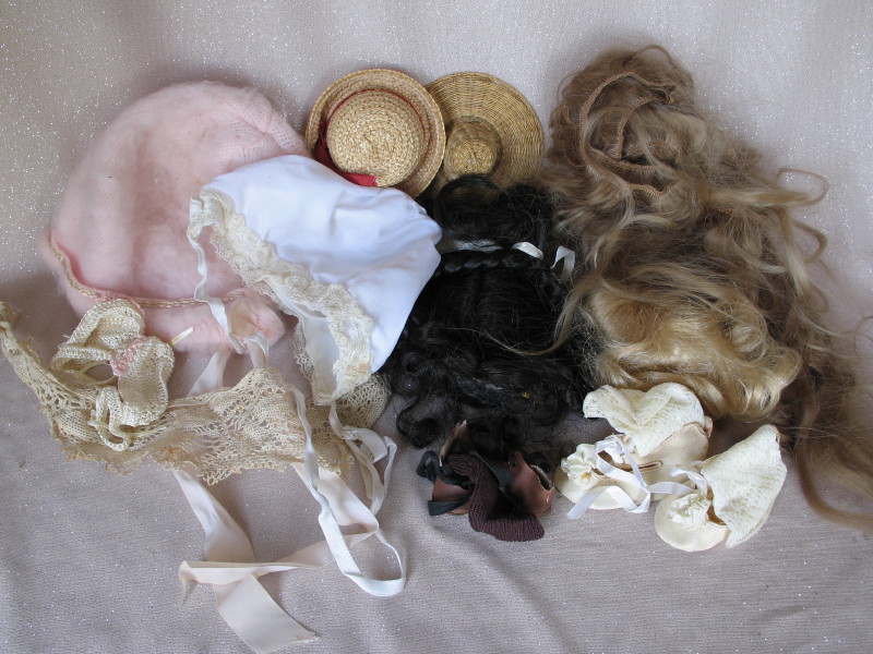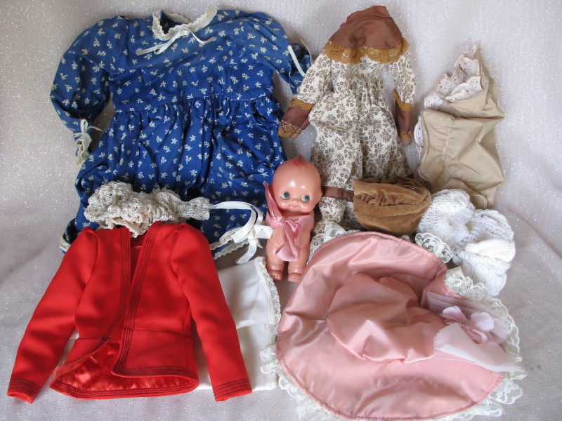 includes mixed used clothes, shoes, wigs, hats, and a small celluloid Kewpie.