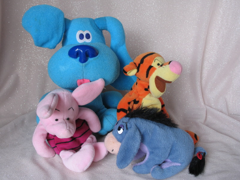 Mixed Soft Toys. Ten Beanie Babies, Disney Eeyore 36cm, 1998 bouncing Tigger 30cm BO, and smaller Tigger, Eeyore, Pooh, Piglet, Blues Clues.