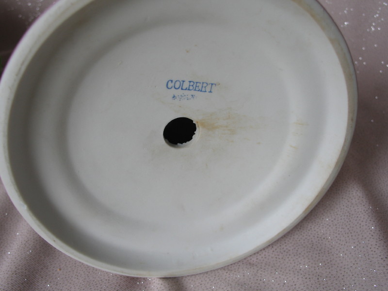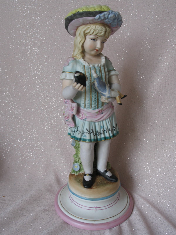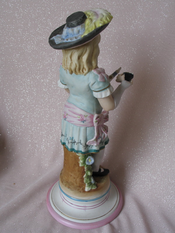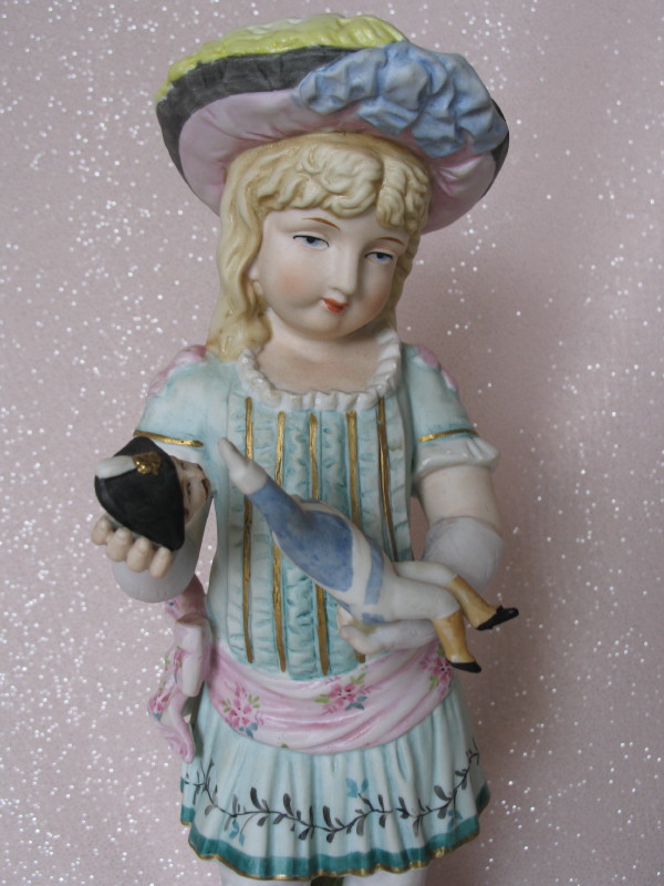 Porcelain Colbert Figurine 32cm. Victorian child with wide brim hat holding her broken Napolean Polichinelle, excellent condition.