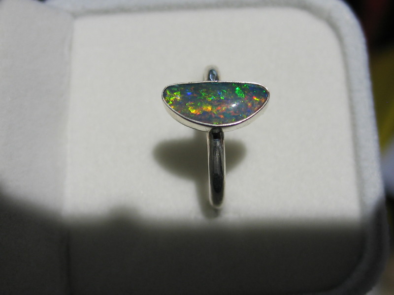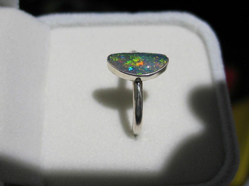 Superior rare Black Opal ‘Half Moon’ lady or girls ring. Superb 12mm Lightning Ridge black opal, N1 darkness/B4 brightness, approx 4ct. Displaying flashing colours green-blue-pink-yellow with each ring movement. Solid Sterling Silver 925 ring. Combined weight 1.8gm and size ‘O’ in new condition.