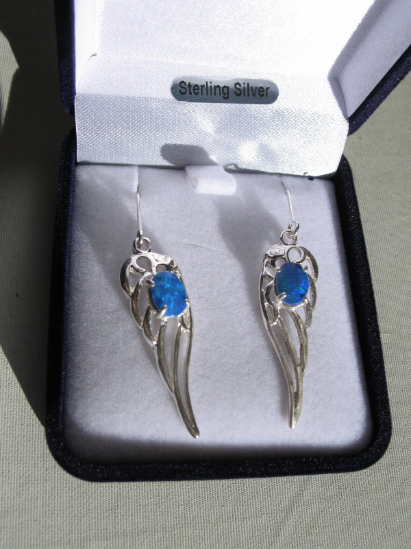 Lovely Opal-SS ‘Wing’ Earrings. New Sterling Silver 3.5cm wing design with vibrant 7cm oval doublet crystal, vibrant blue-green opal, overall weight 4.6gm.