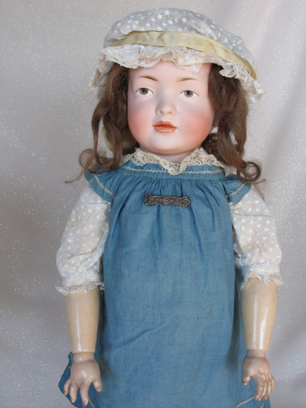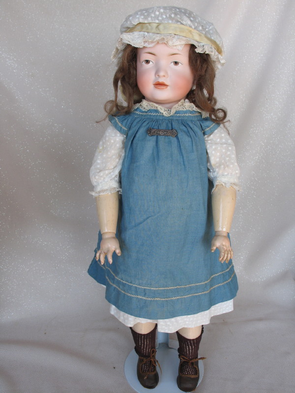 Rare Bahr & Proschild 536 Art Character bisque 18.5” (47cm) c1912 incised 536 // 6, short hairline at back pate rim. Superb intaglio painted brown upper glancing eyes. Black upper lid line and fine short angled upper lashes, feathered short brows, open closed mouth with red accents and gloss red inner space, prominent ears. Original brown mohair wig and cardboard pate. French style ball jointed body with factory finish, missing one finger. Antique white hailspot dress and matching hat, cream petticoat, blue cotton pinafore, brown socks and brown antique shoes. Rare Art Character series by Bahr & Proschild for Kley & Hahn.
