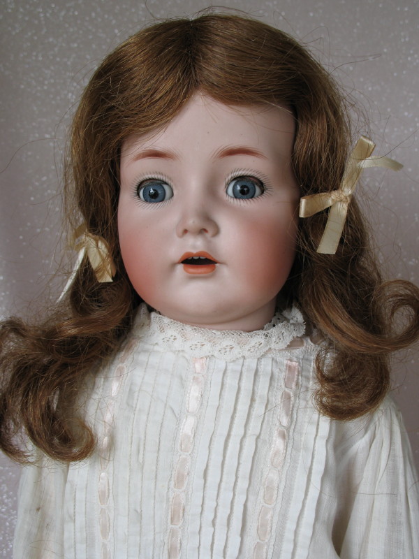 German Kammer & Reinhardt “Mein Liebling Neur” 117n bisque doll 23″ (58cm) c1916. Bisque head incised “K star R //S & H//117n”. Blue glass sleep eyes, angled lashes, gloss brown feathered brows. Open red mouth with shading, four upper teeth. Brown human hair wig and pate. Ball jointed wood composition body with slender fingers. Wearing an inserted lace vintage cotton dropped waist dress, pink ribbon trim, undergarments, white socks, and gray shoes.