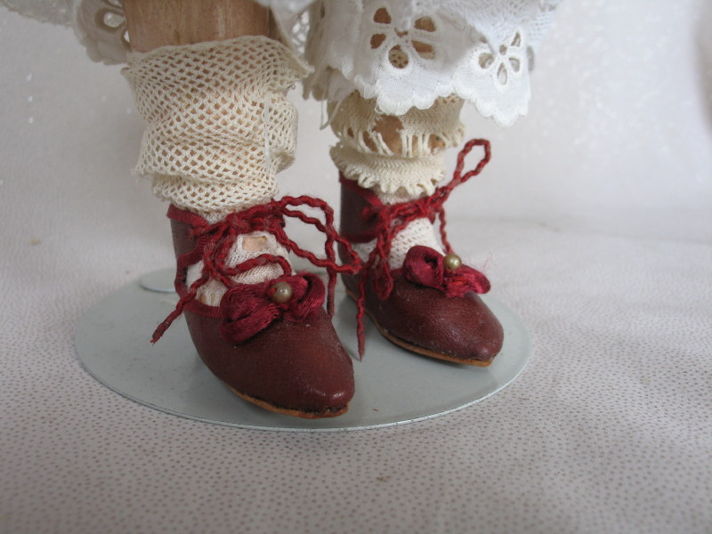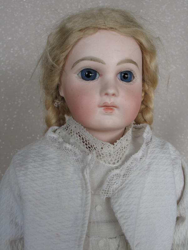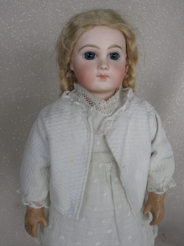 Divine 1878 Emile Jumeau “Premiere Bebe”, 14” (36cm) Pale pressed bisque child. Incised ‘5’ on head. Closed rose pink mouth, peak accents on lips and shading, model white space. Blue glass inset paperweight eyes with angled upper lower lashes, painted eyeliner and rose blush eye shadow, superb feathered brows, accented nostrils and eye corners, lovely soft blush, pierced ears. Blonde mohair wig with plaits over cork pate. French straight wrist composition ball jointed body with original “Jumeau Medaille d’ Or Paris” body stamp, has some old retouches to body. Divine shy expression on this rare first period Bebe from Emile Jumeau. Antique lovely pique hail spot whitewear dress, jacket has lace trim, undergarments, socks, and red leather vintage shoes ~ rare. $5,000 – $6,000