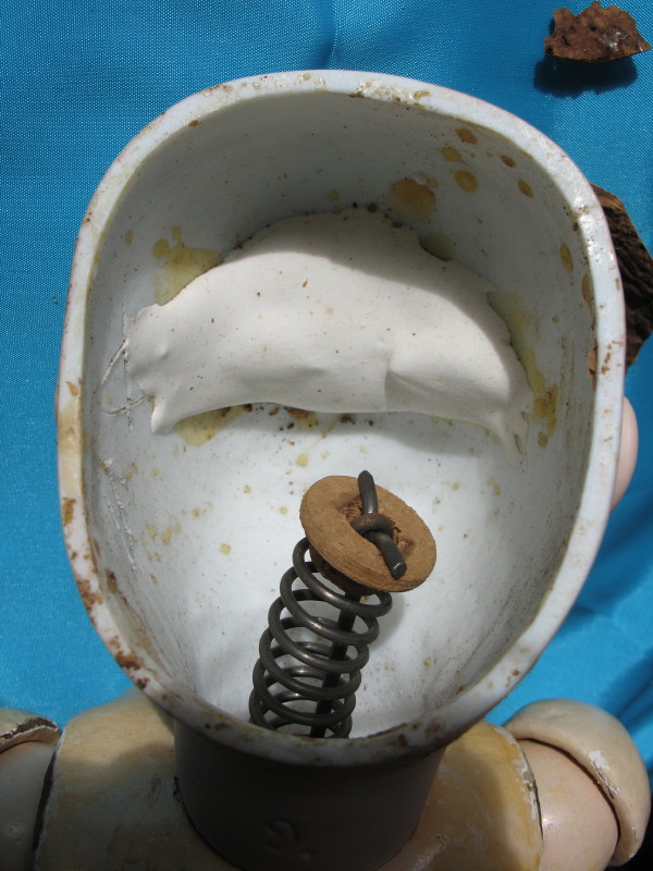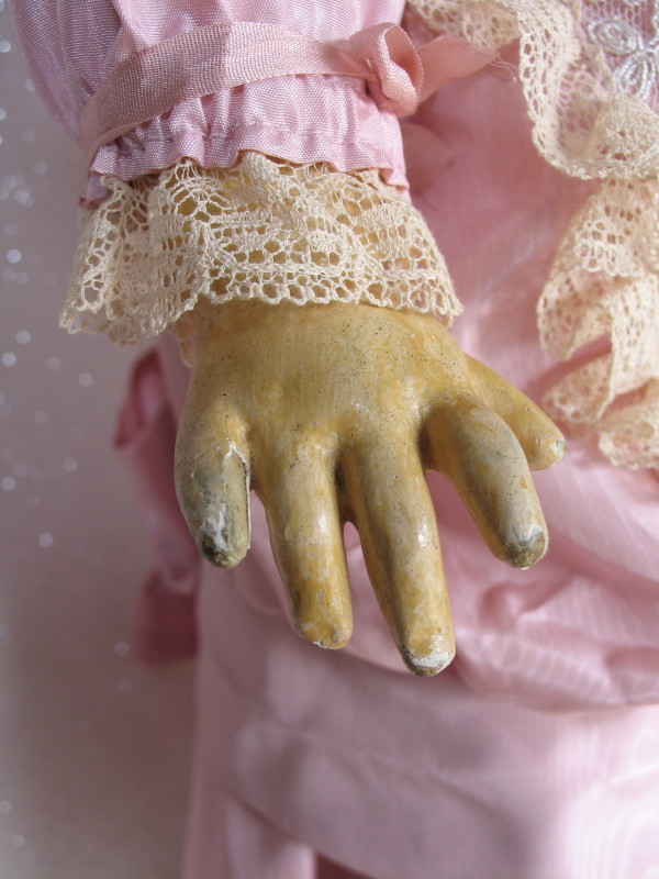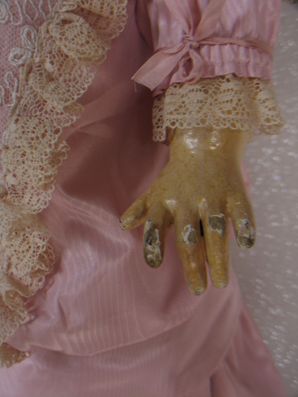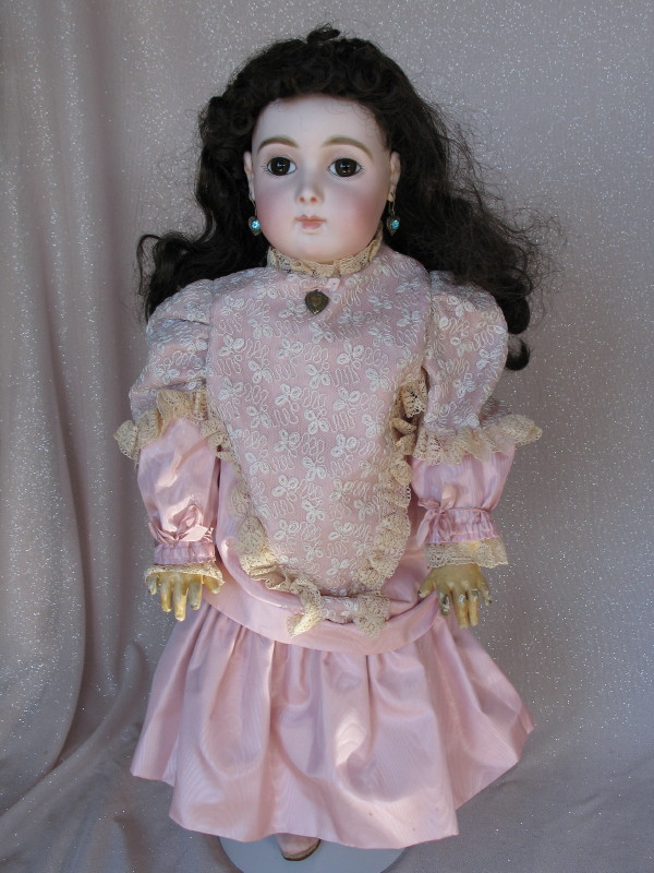 Rare Emile Jumeau “Bebe Triste” c1884 French bisque 20″ (51cm) incised “9.” on neck. Demure, charming expression, closed pink mouth with modeled white space, peak accents and inner shading, shaded nostrils. Separately modeled pierced ears with heart-shaped earrings with a central blue stone. Brown paperweight glass inset eyes, rose-blushed eyeshadow, black eyeliner, and angled lashes. Long, arched brushstroked brows with feathered detail. Original attached bald skin wig over original cork pate and replaced brunette wig. Long original spiral neck spring attachment. Early eight ball jointed wood composition body, blue stamped “Jumeau Medaille d’Or Paris, with straight wrists, some paint wear. Pink dropped waist taffeta walking out dress with attached lace trim, inbuilt petticoat, and heart locket. Silk antique shoes with white mohair trim and cushioned blue silk inner lining. One family owned doll, and the rare smallest size of all the beloved Jumeau Carrier-Belleuse Bebe Triste dolls.