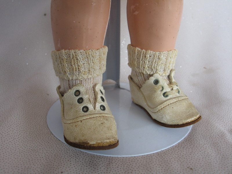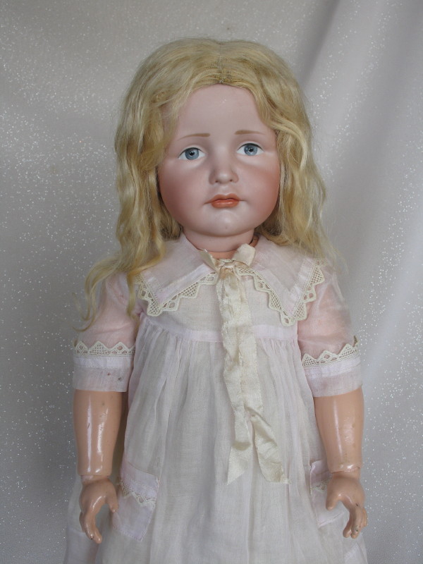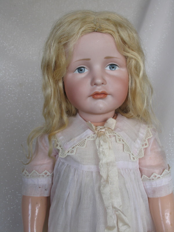 All original c1909 Kammer & Reinhardt 114 “Gretchen” bisque character child 18″ (46cm). Incised ‘K star R // 114 // 46’. Painted blue eyes with accents, black lid line and molded upper eyelids, tapered brows. Superb closed pouty pink gloss mouth, darker inner shading, protruding upper lip, chin dimple and first from mould quality. Original never removed blonde mohair lush wig and pate. Ball jointed very good wood composition body. Original pink organdie dress with pockets, lace trim vee collar with silk ribbons. Original cream petticoat, original cream leather lace up shoes with no laces, and a superior face.