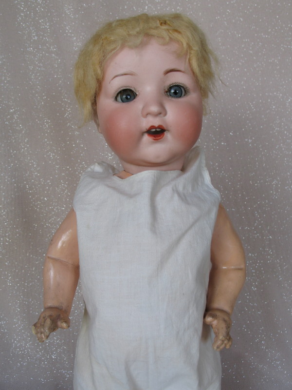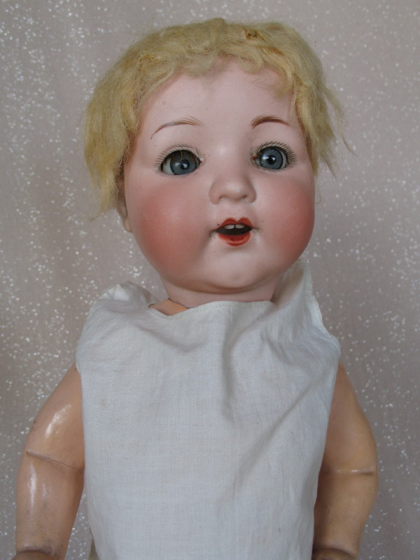Bisque Armand Marseille 995 Toddler 15″ (38cm) doll. Blue glass sleep eyes, angled lashes, brown feathered brows. Open red mouth with peak accents, two teeth. Applied blonde mohair/pate. Toddler five piece slant hip body with tipped four tipped finger and one toe, white cotton onsie only. $150 – $200