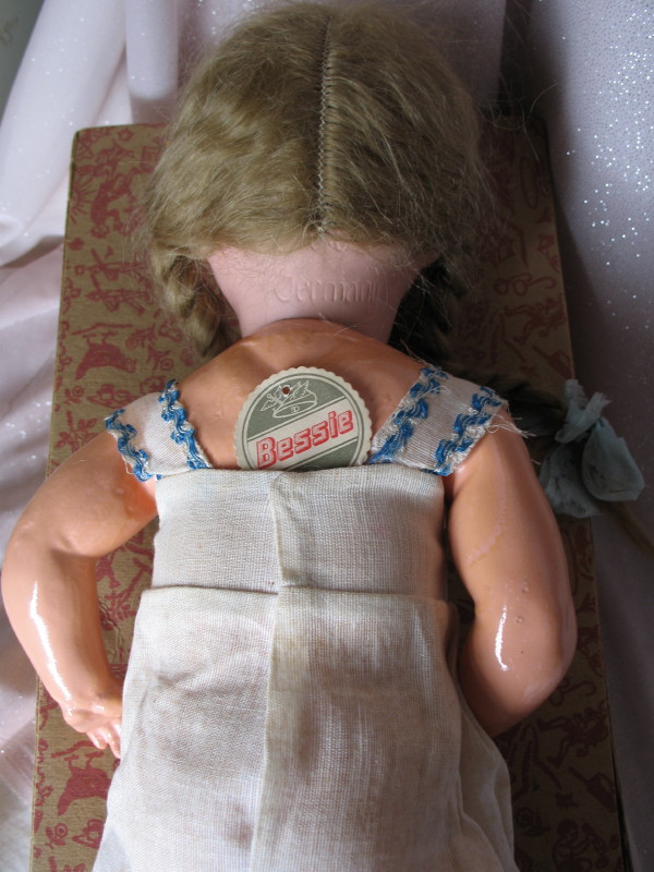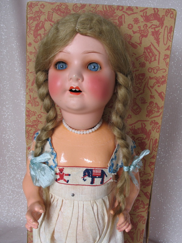MIB Ernst Heubach 320 “Bessie” toddler c1920s 19″ (48cm) clay composition. Blue glass sleeping eye, eye-shadow, feathered brows, open red mouth with two upper teeth, cheek blush, in factory condition. Original blonde never removed mohair wig with two plaits and blue bows. Original factory finish ball jointed slant hip five piece body with red accents. Cream cotton onsie with blue trim, embroidered bear and elephant on chest and original paper “Bessie” Tag. Original box has “Dickie paper end label and red printed toys. Lid has one end piece missing and two side splits. Has original paper /wood packing and tissues. One family owned doll was never played with.