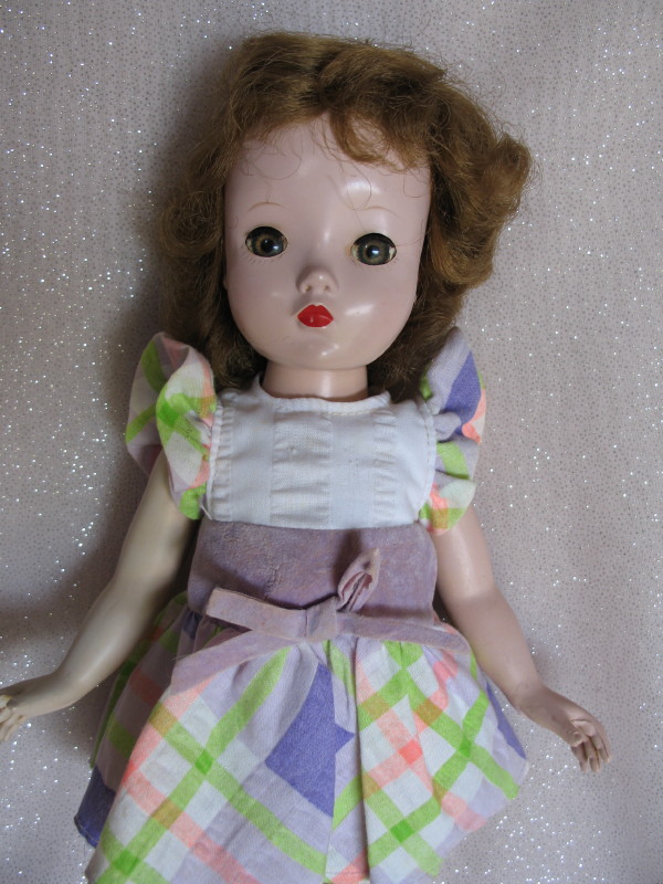 Two 1950s HP Teen 36cm dolls. Madame Alexander Cissy walker 37cm. Sleep eyes, real lashes, brown wig, cotton party frock, shoes.