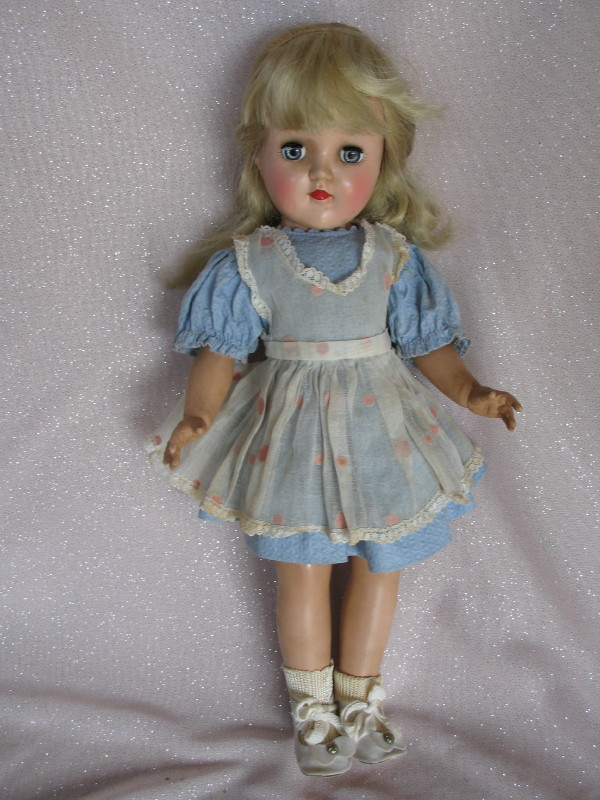 AND Ideal Toni P90 with blonde wig, sleep eyes, real lashes, closed red mouth. Blue cotton party dress and organdy pinafore, socks, and shoes.