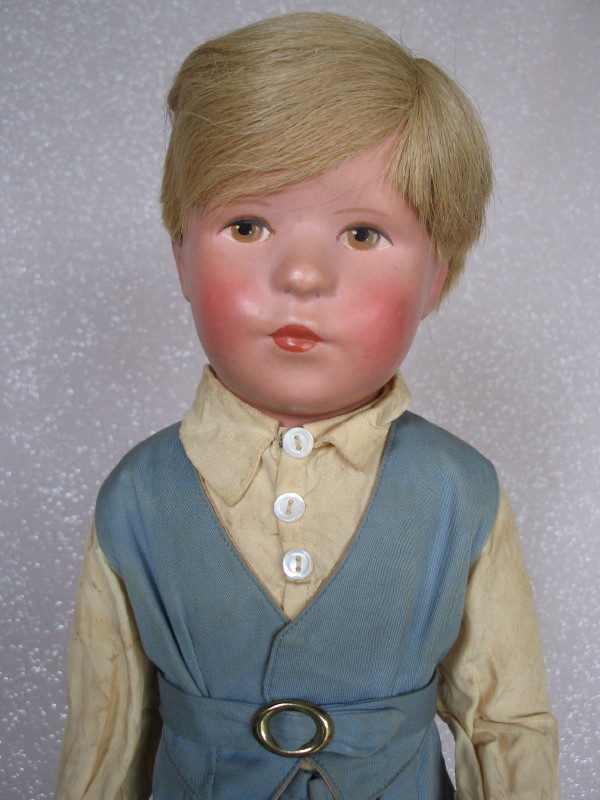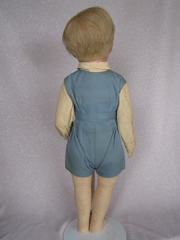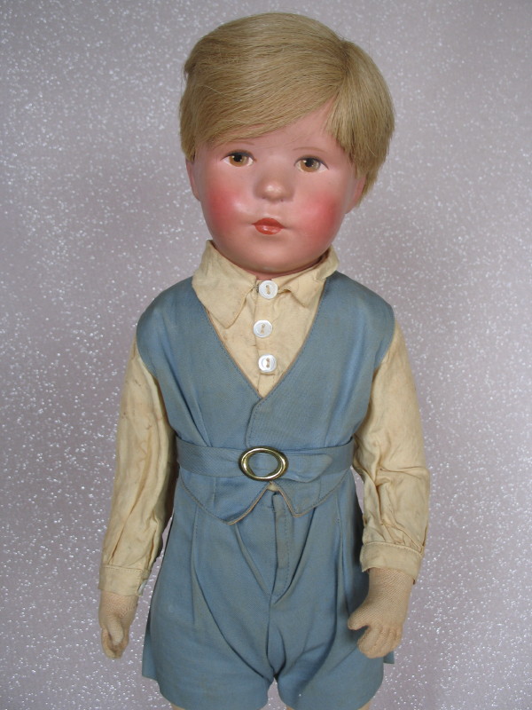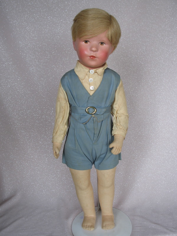 Lot 157. All original 1947 Kathe Kruse “Friedebald” one owner 20″ (51cm). Blonde human short hair in the original set. Swivel hard plastic head with painted features, brown eyes, closed mouth, and cheek blush. Pink cloth body has exposed fade and the hard-to-read marks on the soles are possibly US-Zone, swivel hips, and swing arms. Cream shirt, blue shorts, and attached matching vest with a metal buckle.
