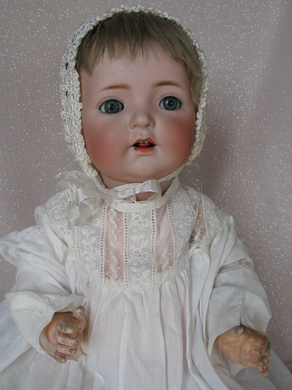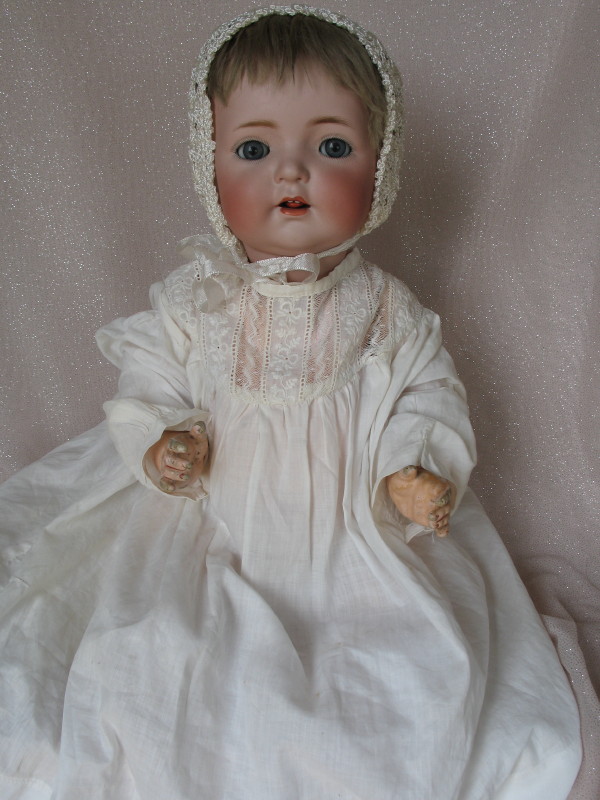 Bisque Kammer & Reinhardt 121 Baby 16″ (41cm) c1916. Blue sleep eyes, angled lashes, feathered brows, open red mouth with two teeth, and a tremble tongue. Never removed original blonde wig and pate. Five piece bent limb composition baby body with some finger wear. White cotton baby gown, with lace inserts, crochet bonnet, and booties.